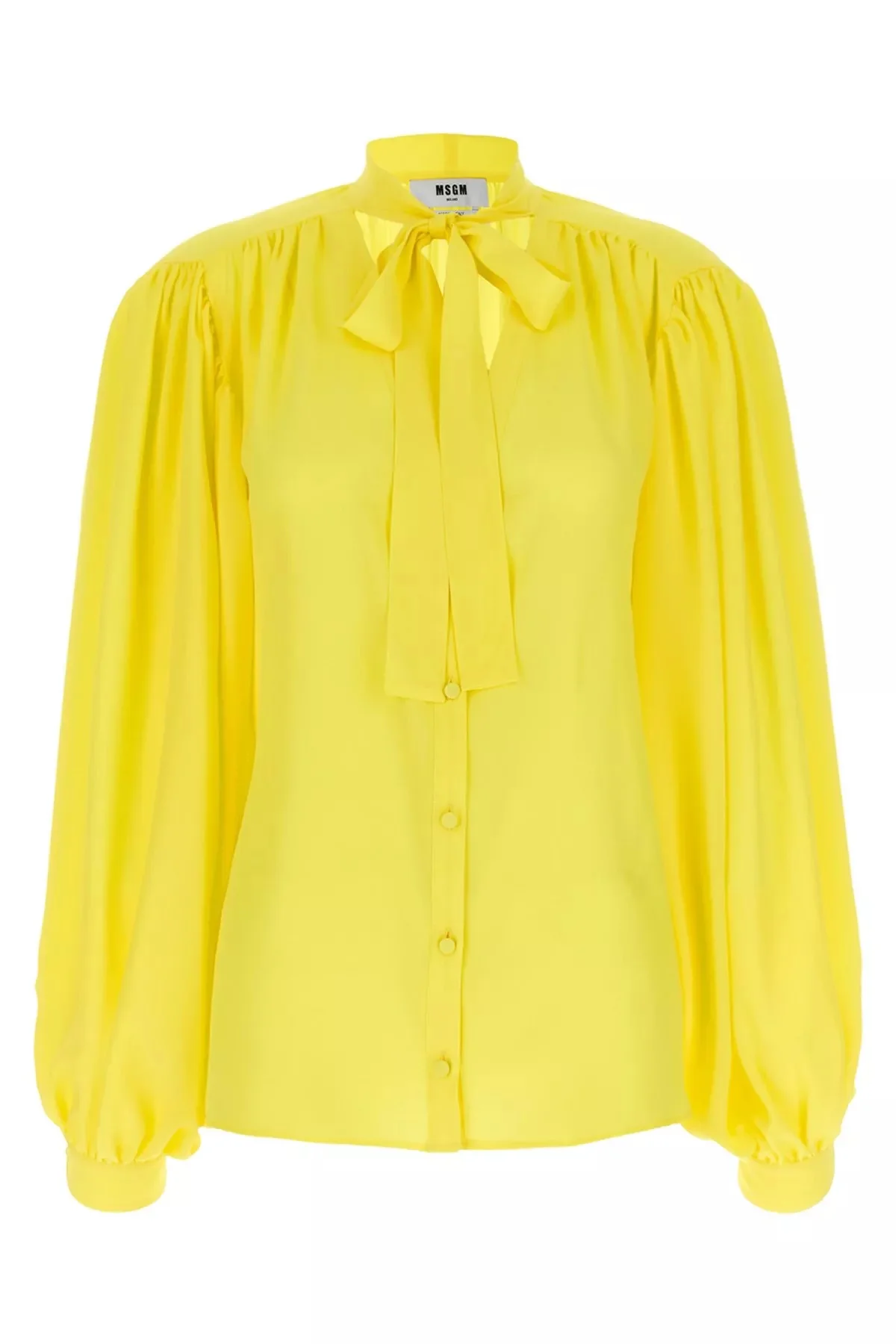 cod. 3641MDE2424710606 Silk blend shirt with bow detail to tie on the neckline, button closure, long and wide sleeves with cuffs. Color: Yellow Size & Fit: true to size fit Composition: 69% acrylic 31% silk