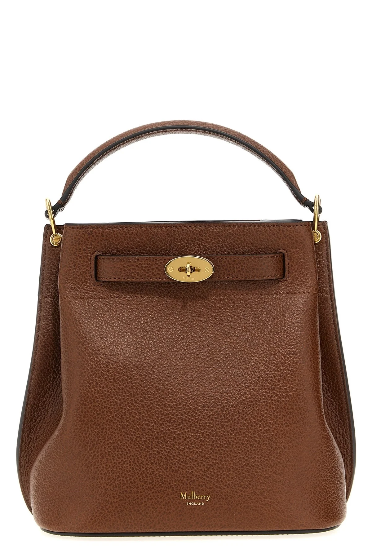 cod. HH9395552G110 Islington bucket bag in hammered leather with front embossed logo, belt closure with metal Postman's Lock, fixed handle, adjustable shoulder strap, and metal details. Color: Brown Size & Fit: W 22 x H 21.5 x D 12.5 cm Composition: 100% calfskin leather (Bos Taurus) Made in: United Kingdom