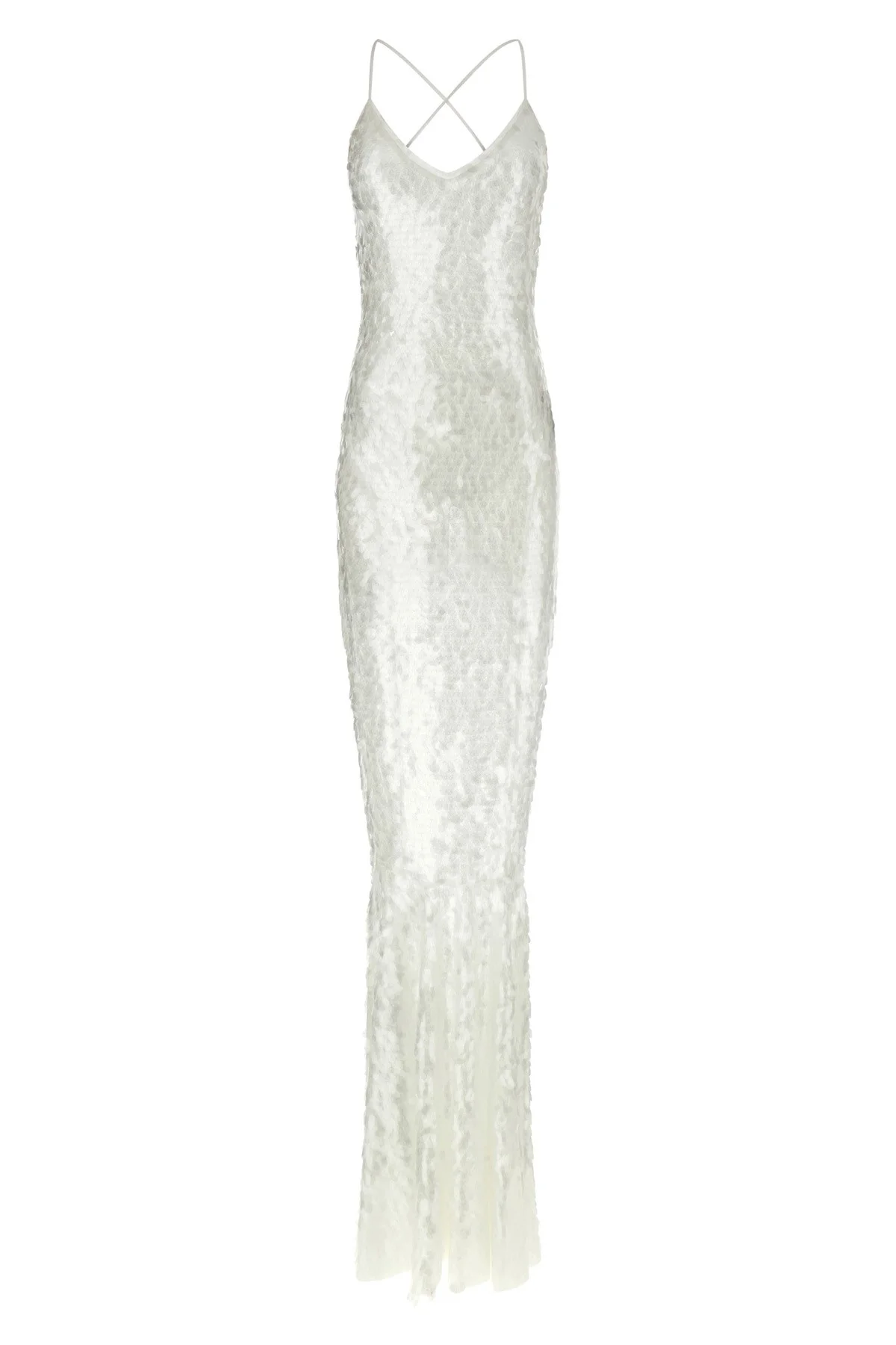 cod. ST4253TQS59965 'Fara' long dress in semi-transparent stretch fabric with all-over tone-on-tone teardrop sequins, wide front V-neck, wide back round neckline with crossover straps, sleeveless, mermaid skirt, inner mesh briefs. Color: White Size & Fit: Slim fit Composition: 88% polyamide, 12% elastane Made in: China