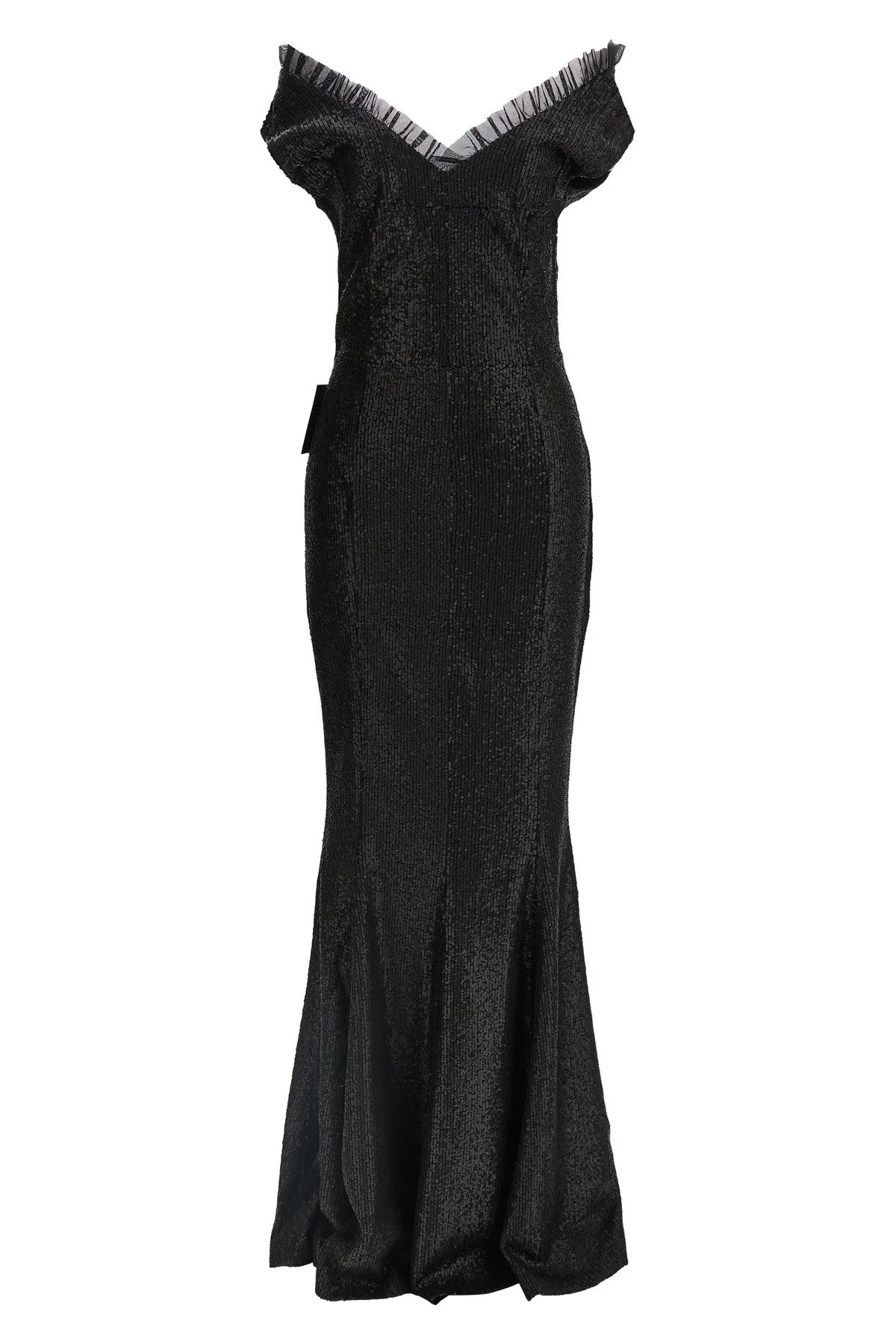 cod. ST4253SQS41001 Long 'Grace' fabric dress with all-over tone-on-tone sequin applique, off-the-shoulder style with tone-on-tone tulle insert curled on top and dropped shoulder, sweetheart neckline, side zip closure, mermaid silhouette skirt. Color: Black Size & Fit: true to size fit Composition: 95% polyester, 5% elastane Made in: China
