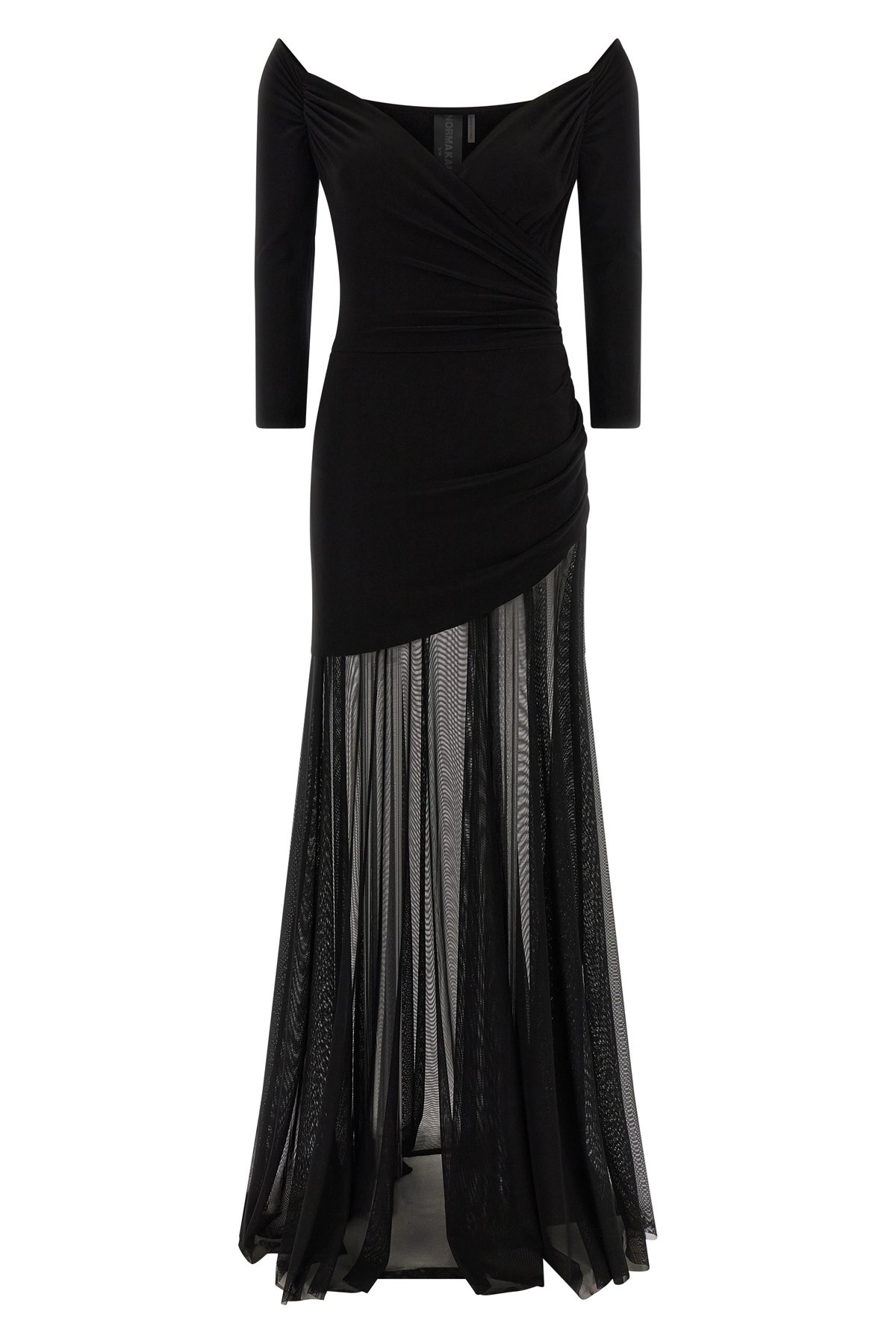 cod. KK3253PMR20001 Dress composed of Poly Lycra 4-way stretch bodysuit, off-the-shoulder model with sweetheart neckline, 3/4 sleeves, front and back curls, asymmetrical hem and semi-transparent mesh maxi skirt, flared line. Color: Black Size & Fit: true to size fit Composition: 95% polyester, 5% elastane Made in: China