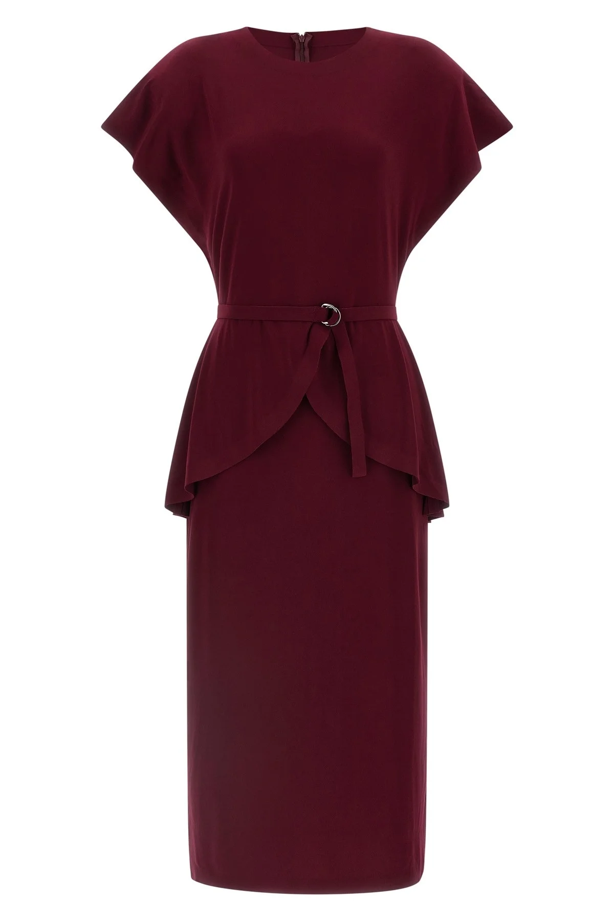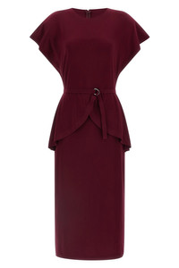 cod. KK4253PLS39043 Stretch fabric midi dress with peplum detail at the waist, crew neck, short sleeves, removable belt. Color: Bordeaux Size & Fit: true to size fit Composition: 95% polyester, 5% elastane Made in: China