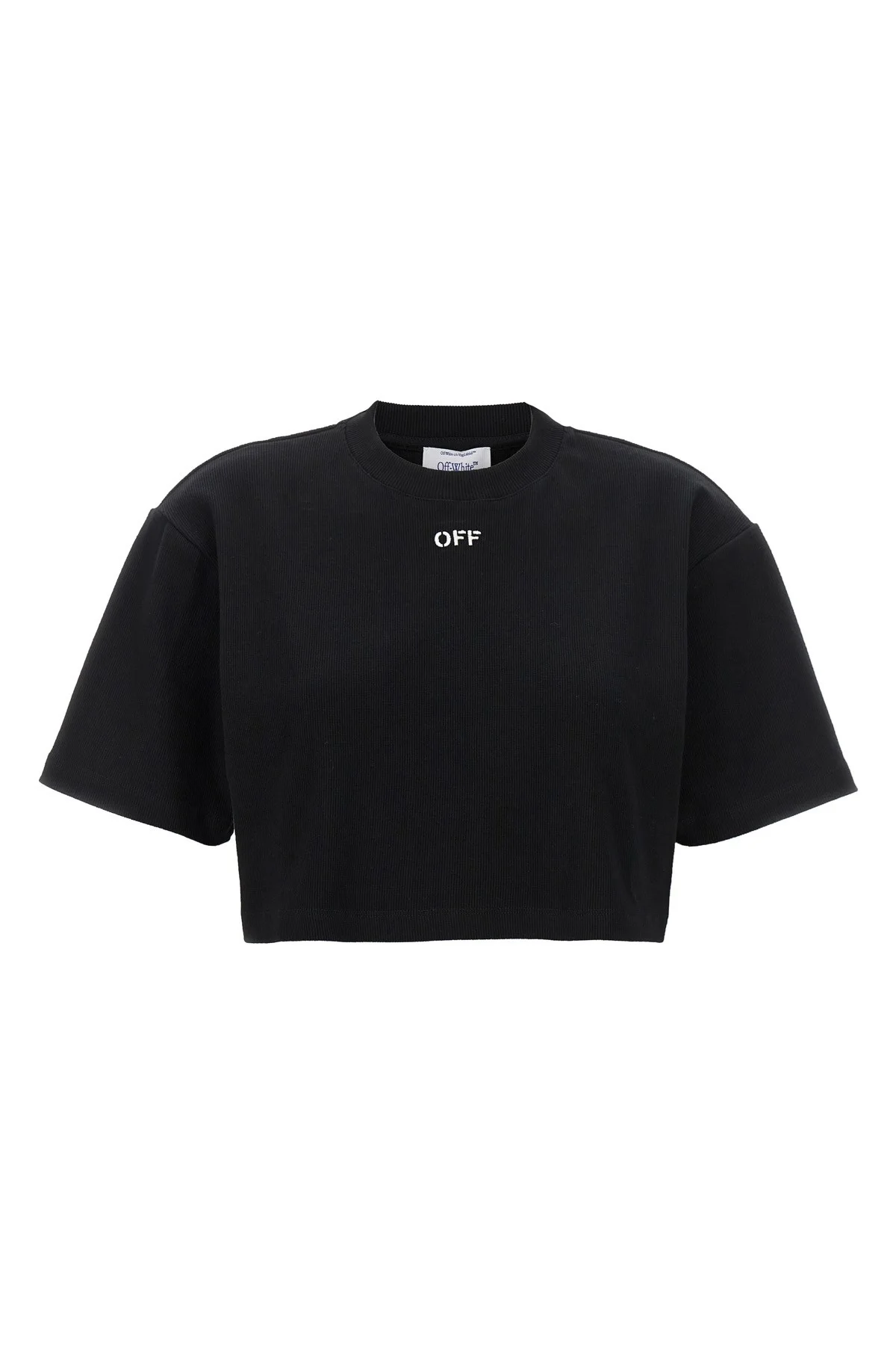 cod. OWAA081C99JER00410011001 'Off stamp' ribbed stretch cotton T-shirt with crop style and contrast logo embroidery. Color: Black Size & Fit: true to size fit Composition: 98% cotton, 2% elastane