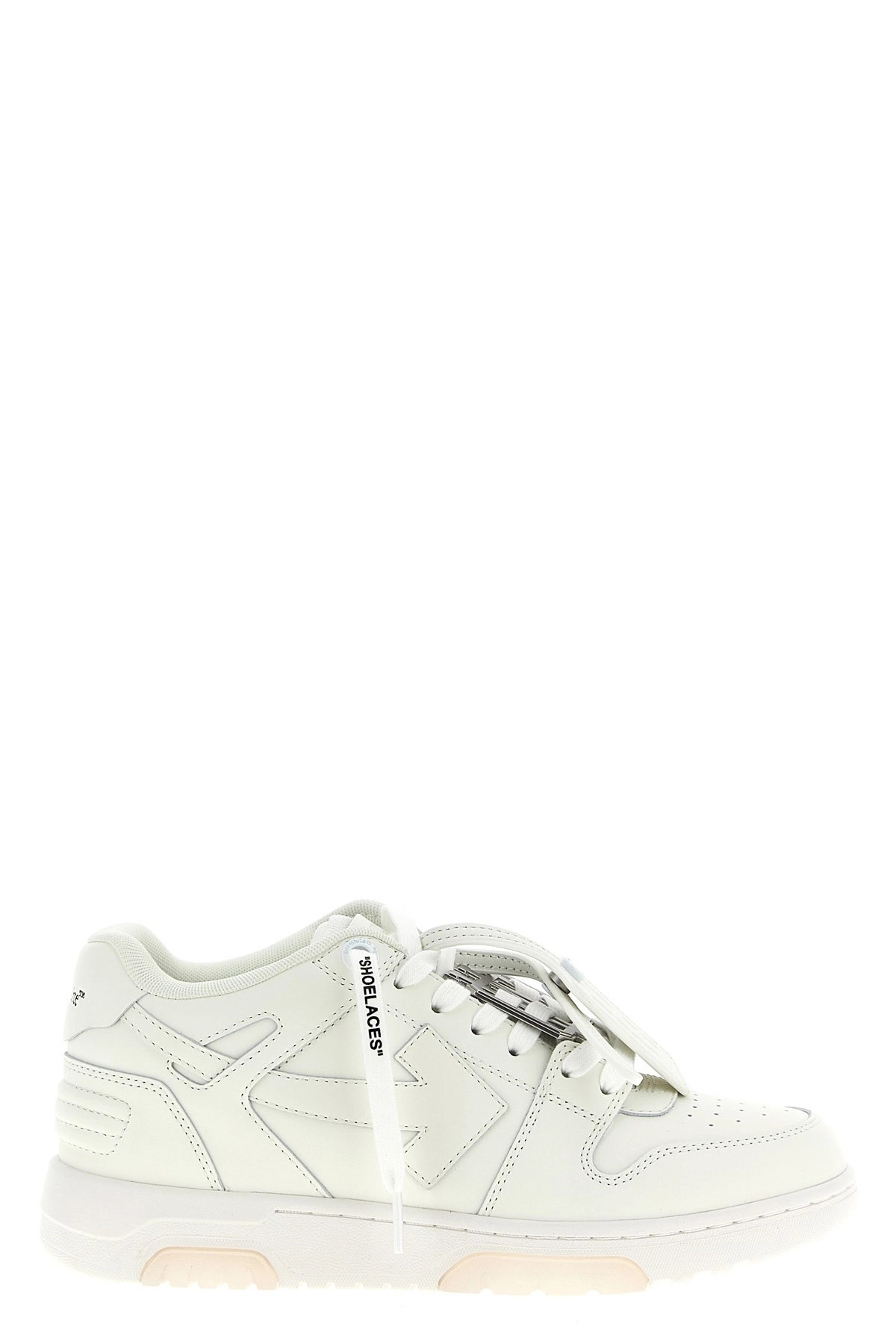 cod. OMIA189F25LEA00801010101 'Out Of Office' leather sneakers, logo tag, removable metal logo laces, rubber sole. Color: White Size & Fit: EU MEN Composition: 85% recycled polyester, 15% polyester Made in: China
