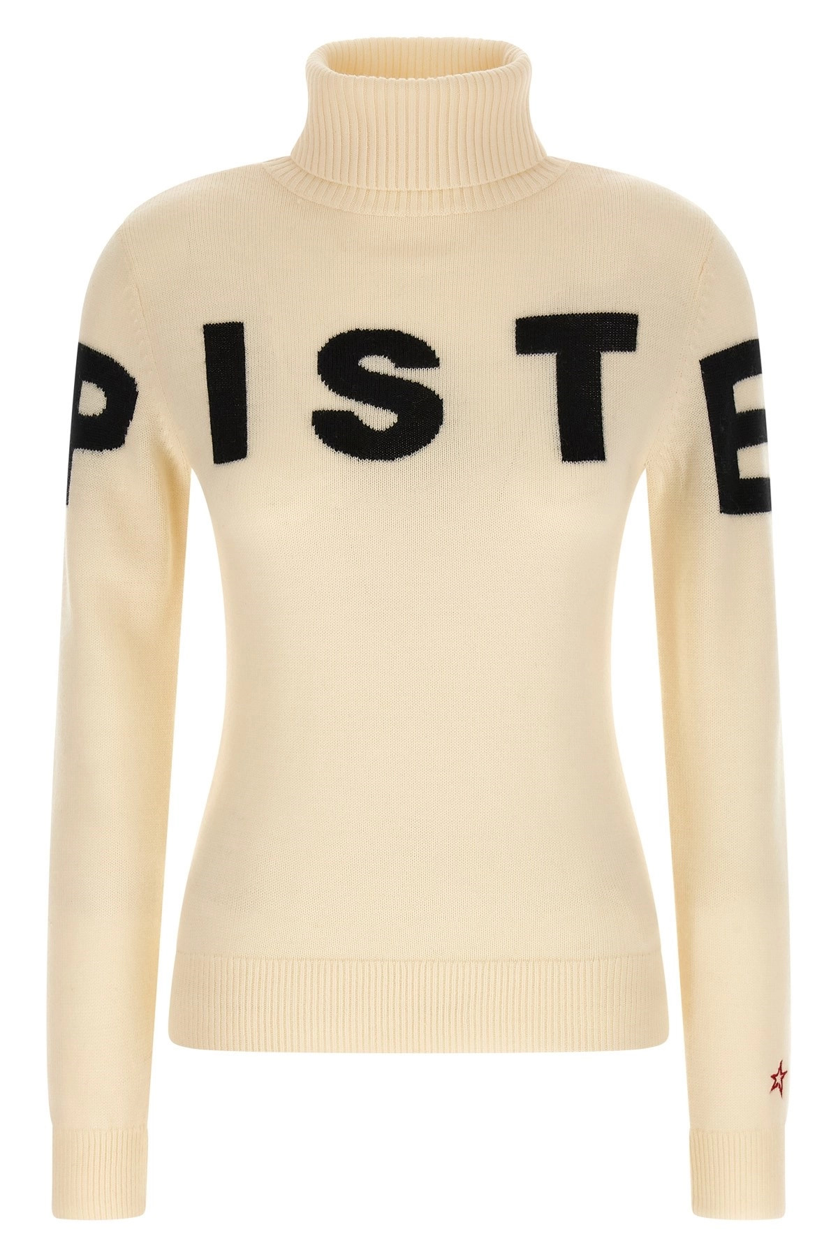 cod. W30006091707 Piste' wool sweater with front jacquard pattern, turned-up high neck, long cuffed sleeves. Color: White Size & Fit: true to size fit Composition: 100% merino wool Made in: China