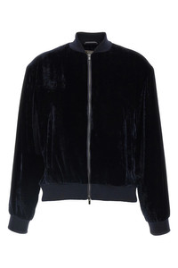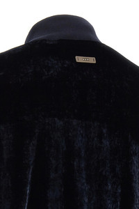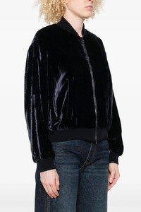 cod. E210463951A60A Washed viscose velvet bomber sweatshirt with stretch ribbed knit details, front zip closure, pockets, long cuffed sleeves. Color: Blue Size & Fit: true to size fit Composition: 82% viscose, 18% polyester Made in: Italy