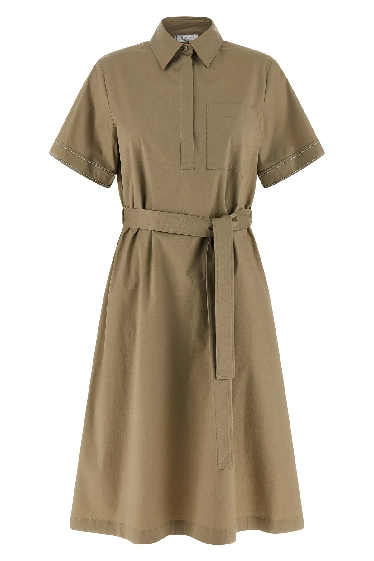 cod. A0253901979136 Chemisier midi dress in cotton poplin with A-line silhouette, front button closure, back elastic waistband with ribbon to tie on the front, short sleeves with metal 'Punto Luce' turn-up on the cuffs. Color: Green Size & Fit: true to size fit Composition: 97% cotton, 3% elastane Made in: Italy