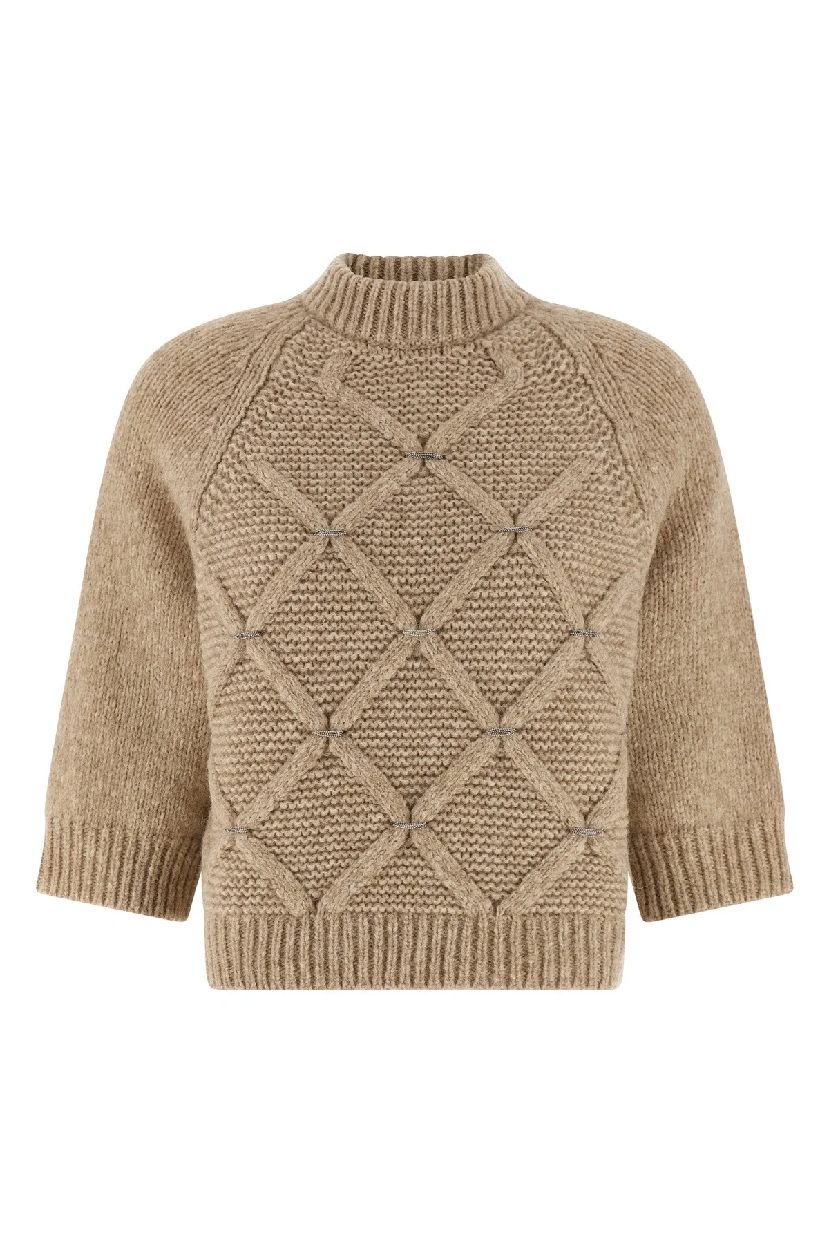 cod. E99010F03R09196947 Alpaca and virgin wool blend knitted sweater with diamonds and front jewel details, crew neck, 3/4 cuffed sleeves. Color: Beige Size & Fit: true to size fit Composition: 55% alpaca wool 23% virgin wool 22% polyamide Made in: Italy