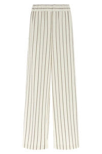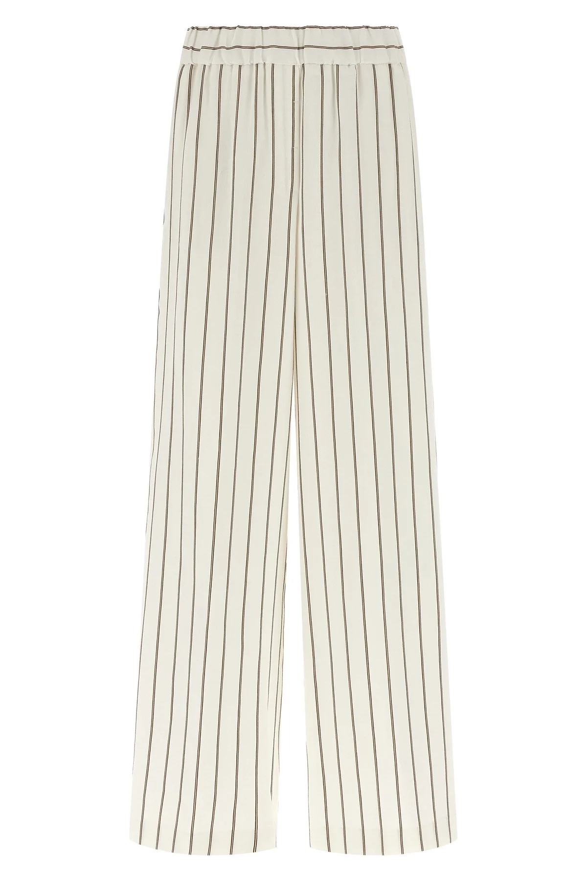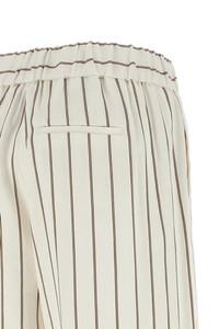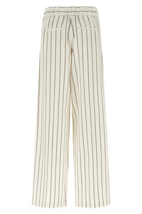 cod. A0405200676102 Pinstriped cotton linen twill pants, straight and wide leg, stretched pleat, elastic waistband, trompe l'oeil flap, pockets. Color: White Size & Fit: true to size fit Composition: 66% linen, 34% cotton Made in: Italy