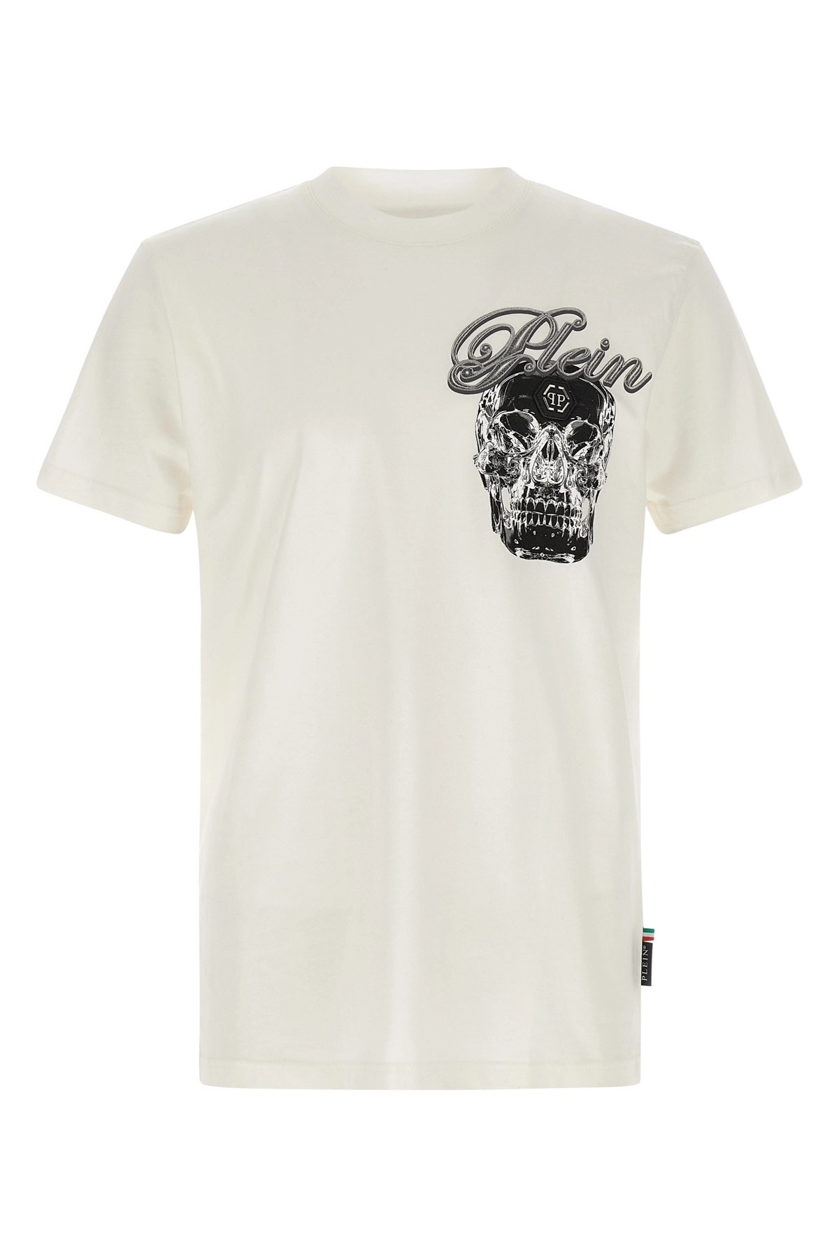 cod. FAECMTK8530PJY002N01OF Cotton jersey T-shirt, printed foil 'Glass Skull' and leather patch with front metal logo, crew neck, short sleeves. Color: White Size & Fit: true to size fit Composition: 100% cotton Made in: Italy