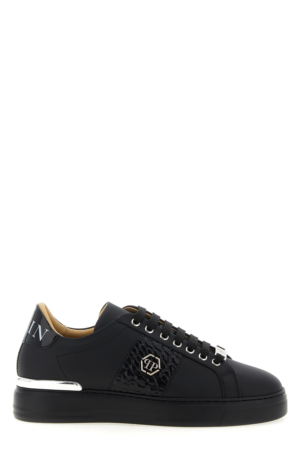 cod. FAESUSC0664PLE010N0202 'Hexagon' nappa sneakers, side band in crocodile-printed paint with metal logo applique, patent leather heel with logo print, lace-up closure, midsole in high-tech ergonomic cushioning rubberized material, rubber sole. Color: Black Size & Fit: EU MEN Composition: 100% cow leather (Bos Taurus) Made in: Italy