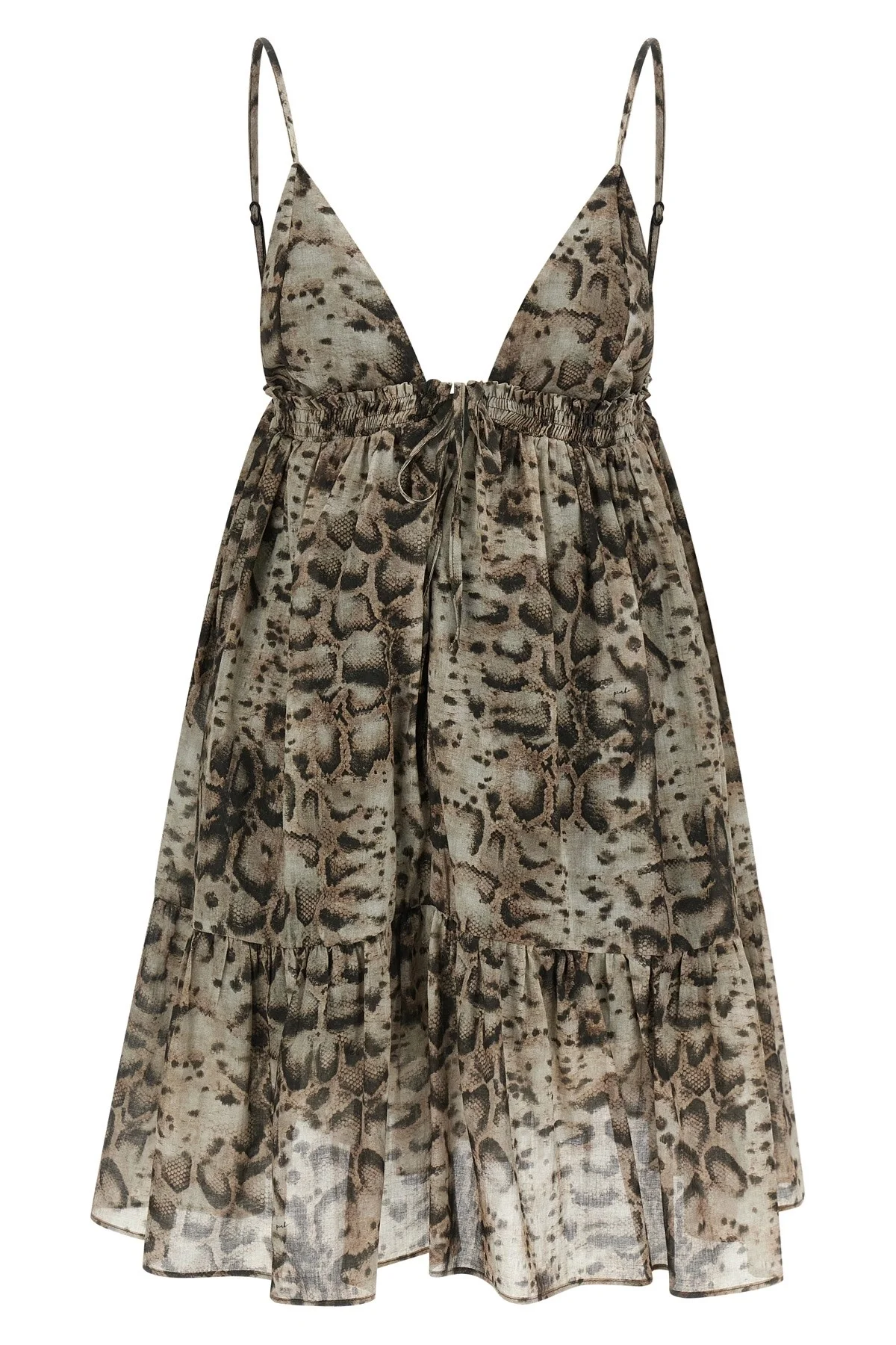 cod. 106917A3APCZ9 'Adrano' mini dress in cotton muslin with all-over snake print, lining, deep front V-neck, square neckline at the back, thin adjustable straps, sleeveless, elastic band with tie-up strap, curls and small ruffles under the bust, flared skirt with flounces on the hem. Color: Gray Size & Fit: true to size fit Composition: 100% cotton Made in: Italy
