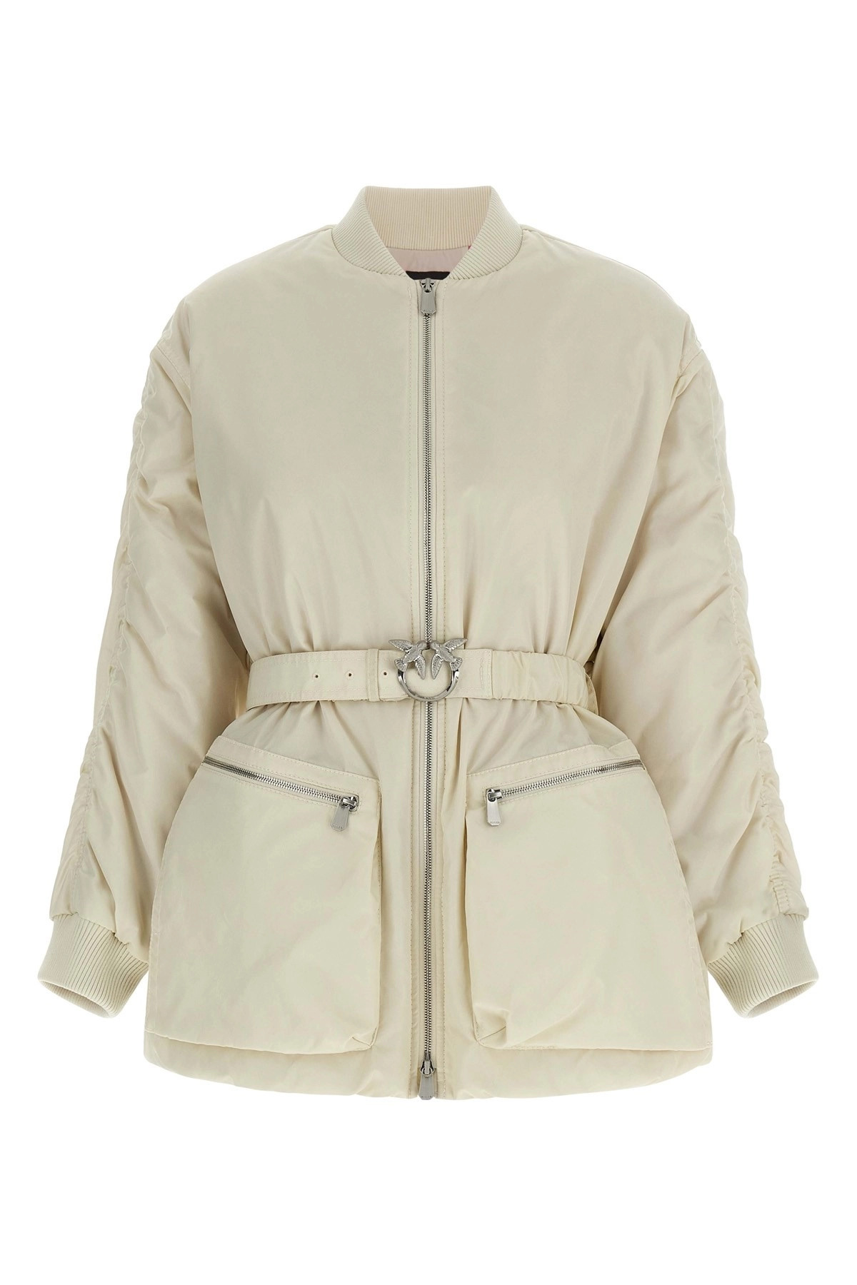 cod. 105340A2OLC14 Long 'Bacon' bomber jacket in technical satin with stretch ribbed knit details, high neck, front zip closure, pockets, long crinkled sleeves with cuffs and dropped shoulder, removable belt, contrast fabric lining. Color: Beige Size & Fit: Comfort fit Composition: 100% polyamide Made in: China