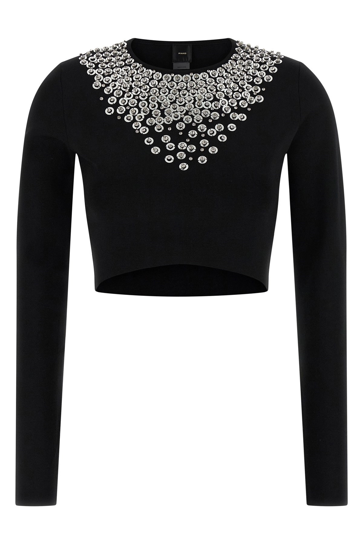 cod. 105734A2UTZI1 'Big Jim' viscose blend sweater with front sequins and crystal applique, crop model, round neckline, long sleeves. Color: Black Size & Fit: true to size fit Composition: 83% viscose, 17% polyester Made in: China