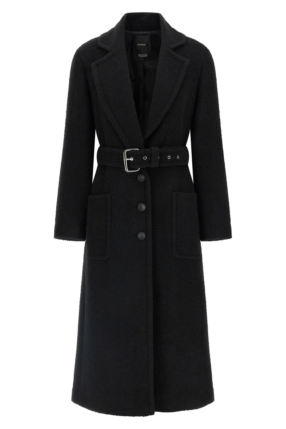 cod. 105695A2UBZ99 Long 'Cerfoglio' single-breasted coat in diagonal boucle wool blend fabric with front button closure, lapel collar, patch pockets, long sleeves, back split, removable belt, viscose blend lining. Color: Black Size & Fit: true to size fit Composition: 40% polyester 38% wool 14% acrylic 8% polyamide Made in: China