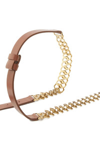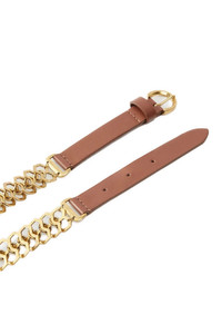 cod. 105893A2XIL17Q Smooth leather belt with double side chain insert, gold galvanic buckle. Color: Brown Size & Fit: H 2 cm Composition: 100% calfskin leather (Bos Taurus) Made in: Italy
