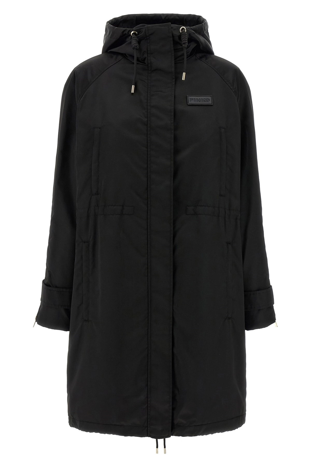 cod. 106015A2ZAZ99 'Delma' 2-in-1 long parka consisting of shiny nylon canvas outer part, fleece lining, adjustable hood, tone-on-tone silicone logo patch and zip and snap button closure on the front, pockets, drawstring at the waist and at the hem, long sleeves with zip on the cuffs, asymmetrical hem with tail split at the back and removable double-sided vest in quilted and slightly padded nylon, Contrast lining, high neck, front zip closure, pockets. Color: Black Size & Fit: true to size fit Composition: 100% polyamide Made in: China