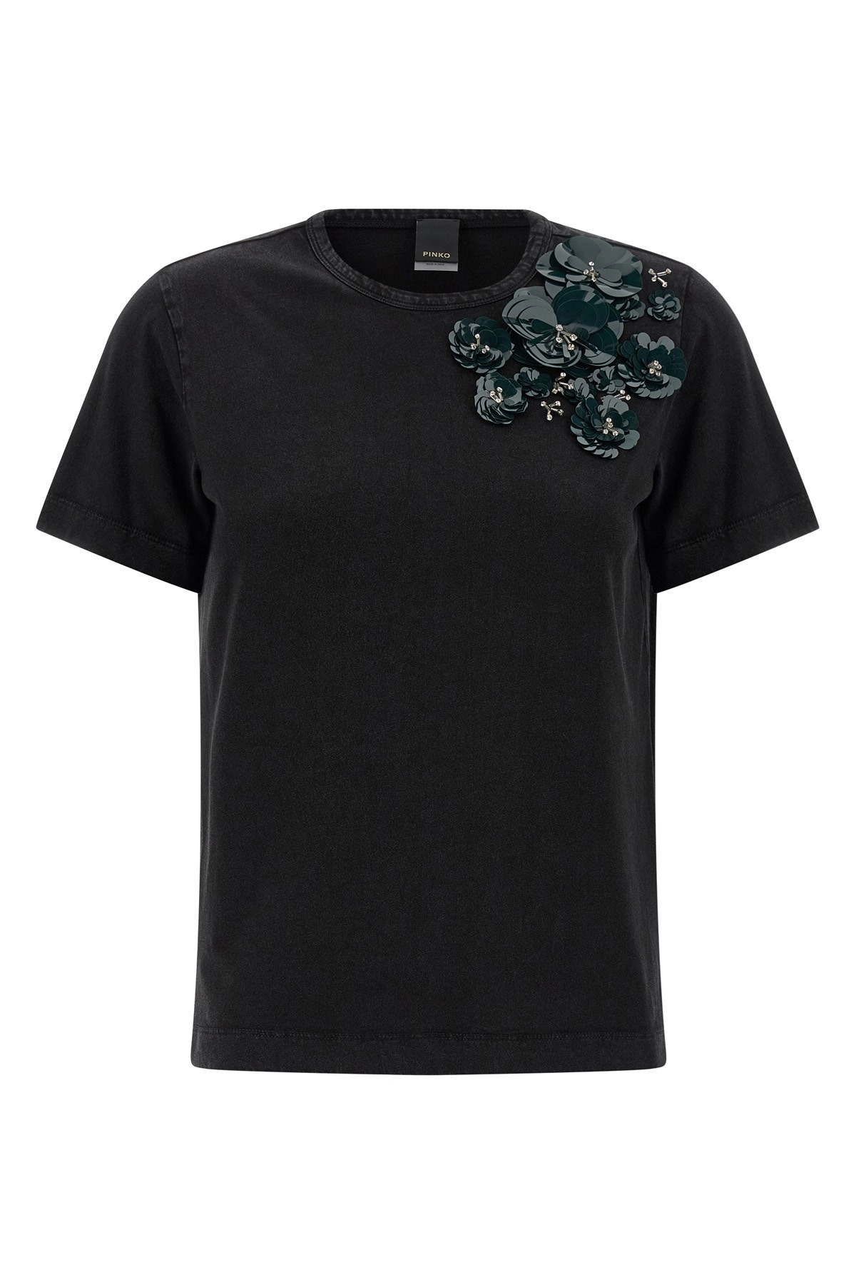 cod. 106030A2ZLZ98 'Dominga' delave cotton jersey t-shirt, jewel decoration with crystals and sequins with front paint effect, crew neck, short sleeves. Color: Black Size & Fit: true to size fit Composition: 100% cotton Made in: India