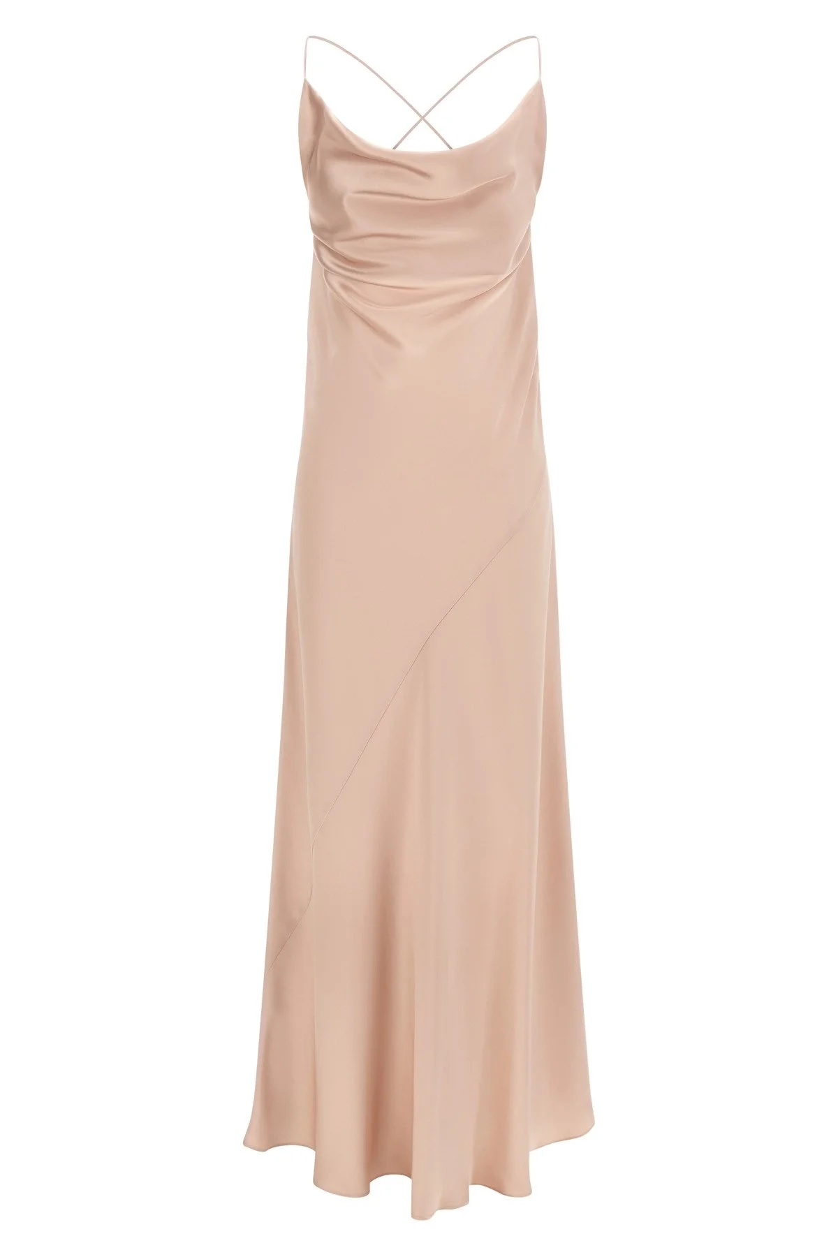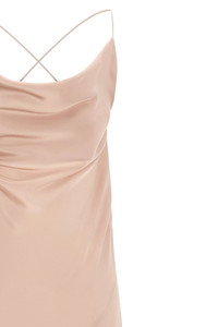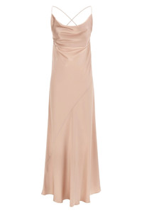 cod. 106587A1Y5Q35 Farro' long satin dress with thin straps with crossover and back drawstring closure, front draped neckline, flared silhouette, wide back neckline, sleeveless. Color: Pink Size & Fit: true to size fit Composition: 91% acetate, 9% polyester Made in: Italy
