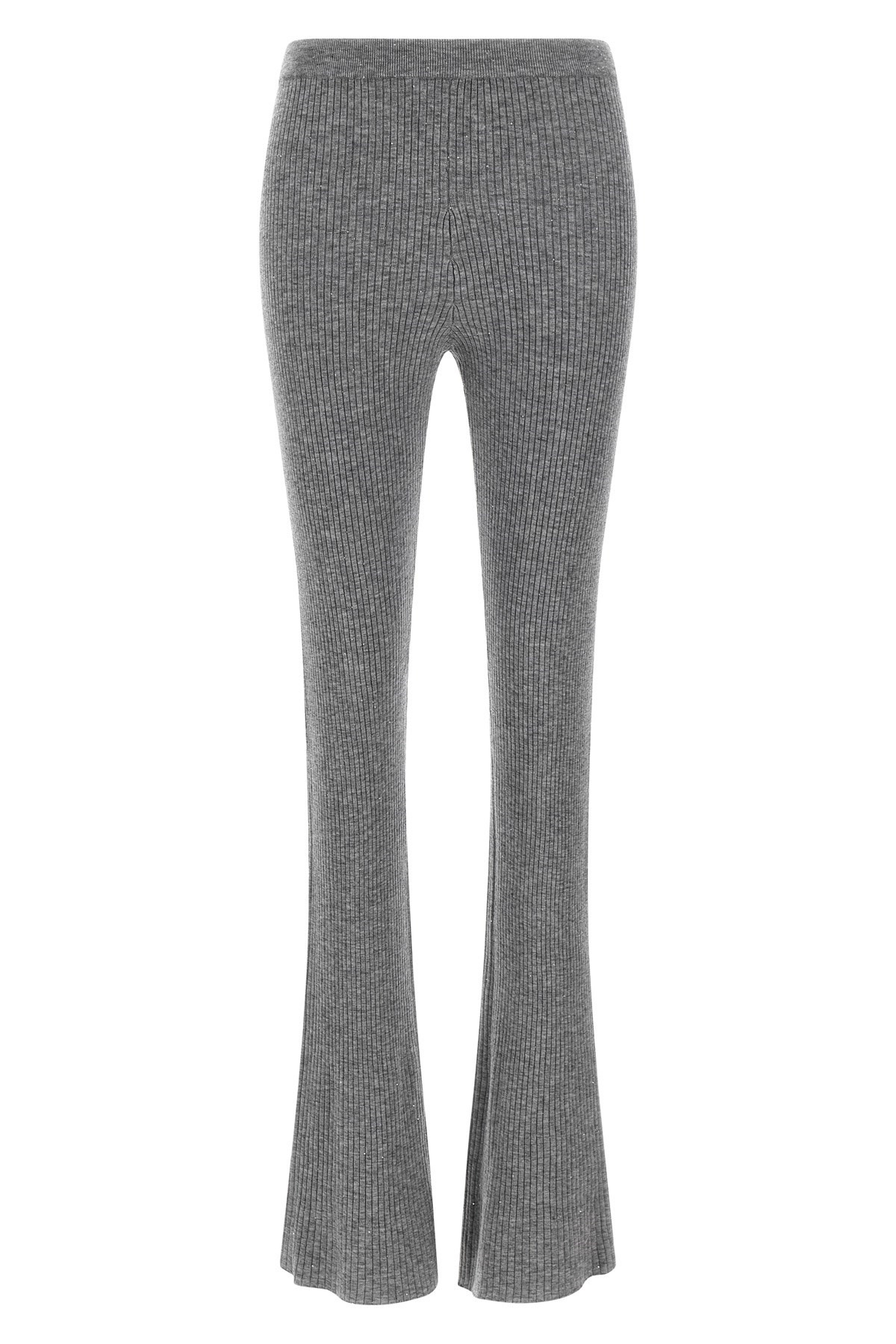 cod. 105880A2PMI42 Ultrafine ribbed wool 'Ibiza' pants with all-over sequin applique, flared leg, elastic waistband, tone-on-tone logo patch at the back. Color: Gray Size & Fit: true to size fit Composition: 68% wo, 30% pa, 2% pl Made in: China