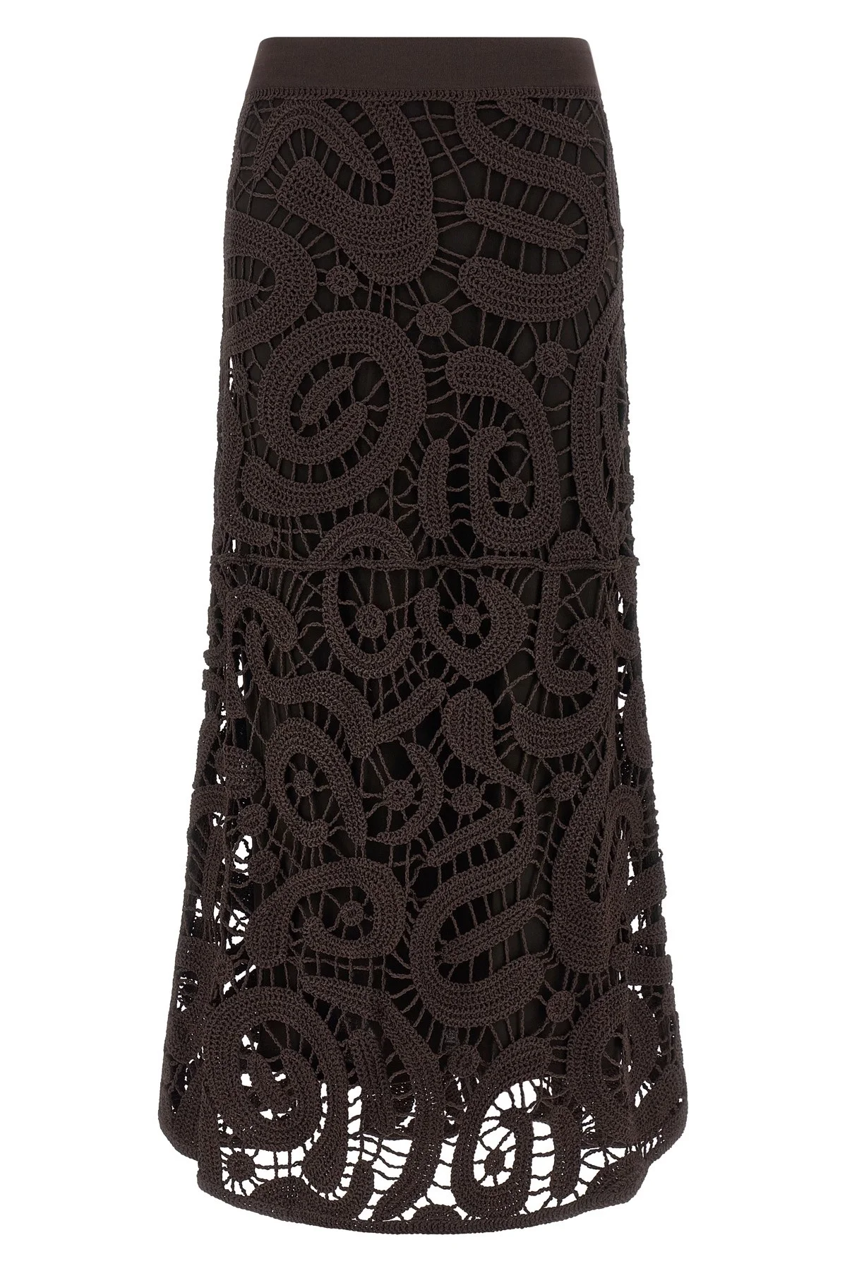 cod. 106353A354M05 'Maestrale' crochet viscose midi skirt, flared silhouette, elastic waistband, removable underskirt. Color: Brown Size & Fit: true to size fit Composition: 63% viscose, 37% polyamide Made in: China