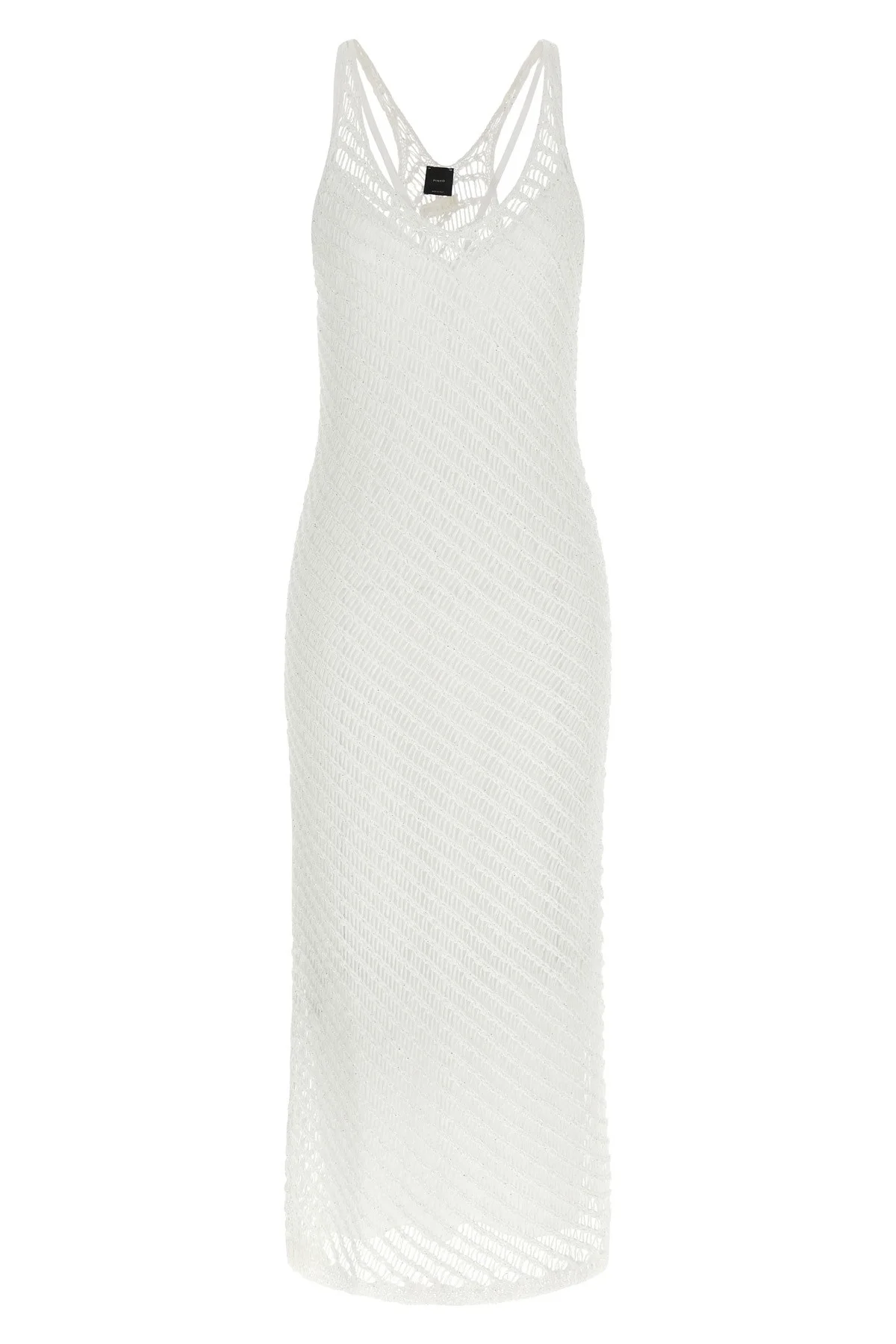 cod. 106477A36HZI6 Long 'Miraggio' mesh viscose blend dress with all-over micro sequin application, straight silhouette, wide V-neck, rowing neck and back logo patch, sleeveless, removable petticoat. Color: White Size & Fit: true to size fit Composition: 55% polyester, 45% viscose Made in: Italy