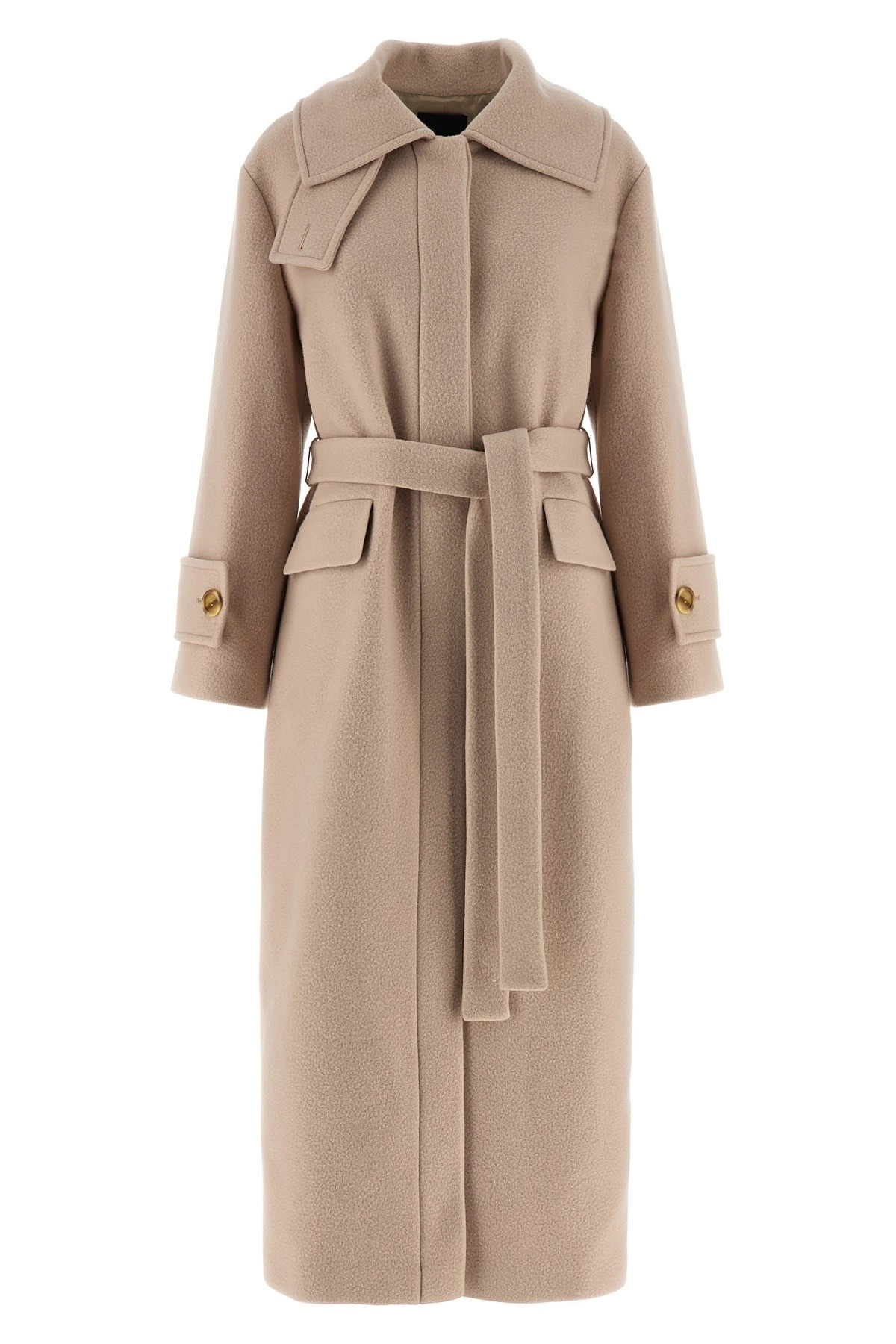 cod. 106154A30VC50 'Paquita' coat in wool-effect fabric, shirt collar with flap that can be closed at the neck, front closure with covered buttons, knotted belt at the waist, long sleeves with martingale on the cuff. Color: Gray Size & Fit: True to size fit Composition: 100% polyamide Made in: Italy