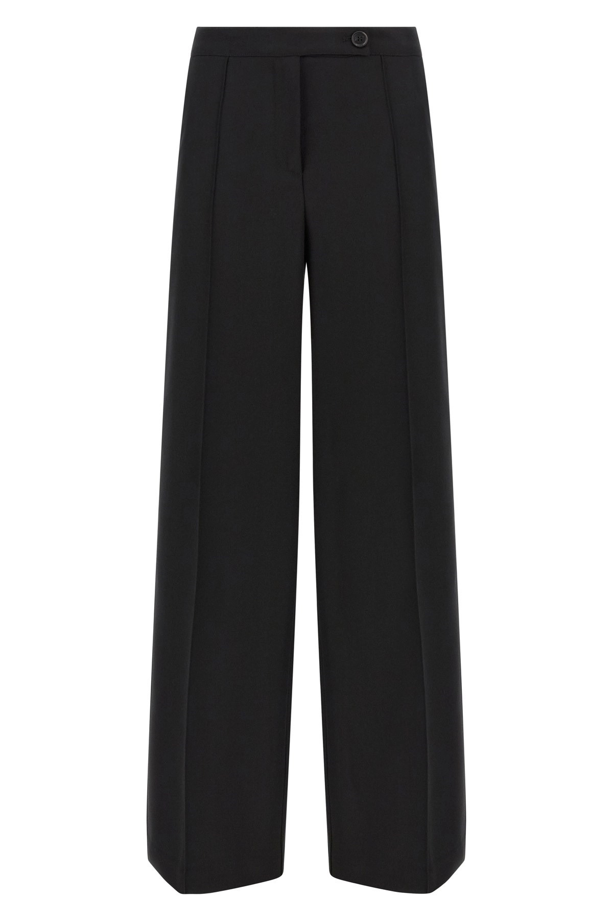 cod. 106140A30CZ99 'Placida' wool flannel pants with viscose diagonal pattern with tone-on-tone trimming side insert, front stitching, wide and straight leg, zip and button closure, pockets. Color: Black Size & Fit: true to size fit Composition: 55% wool 28% polyester 15% viscose 2% elastane Made in: Italy
