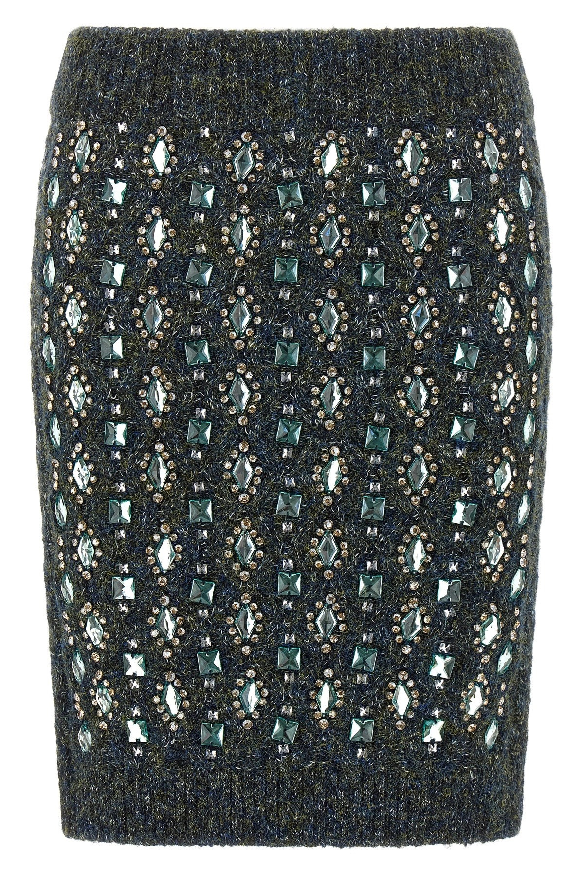 cod. 105967A2YCIG1 'Strong Enough' miniskirt in wool-blend mouline melange knit with geometric patterns of crystals and pearls on the front, elastic waistband, back logo patch. Color: Multicolor Size & Fit: true to size fit Composition: 85% polyester 13% acrylic 2% elastane Made in: China