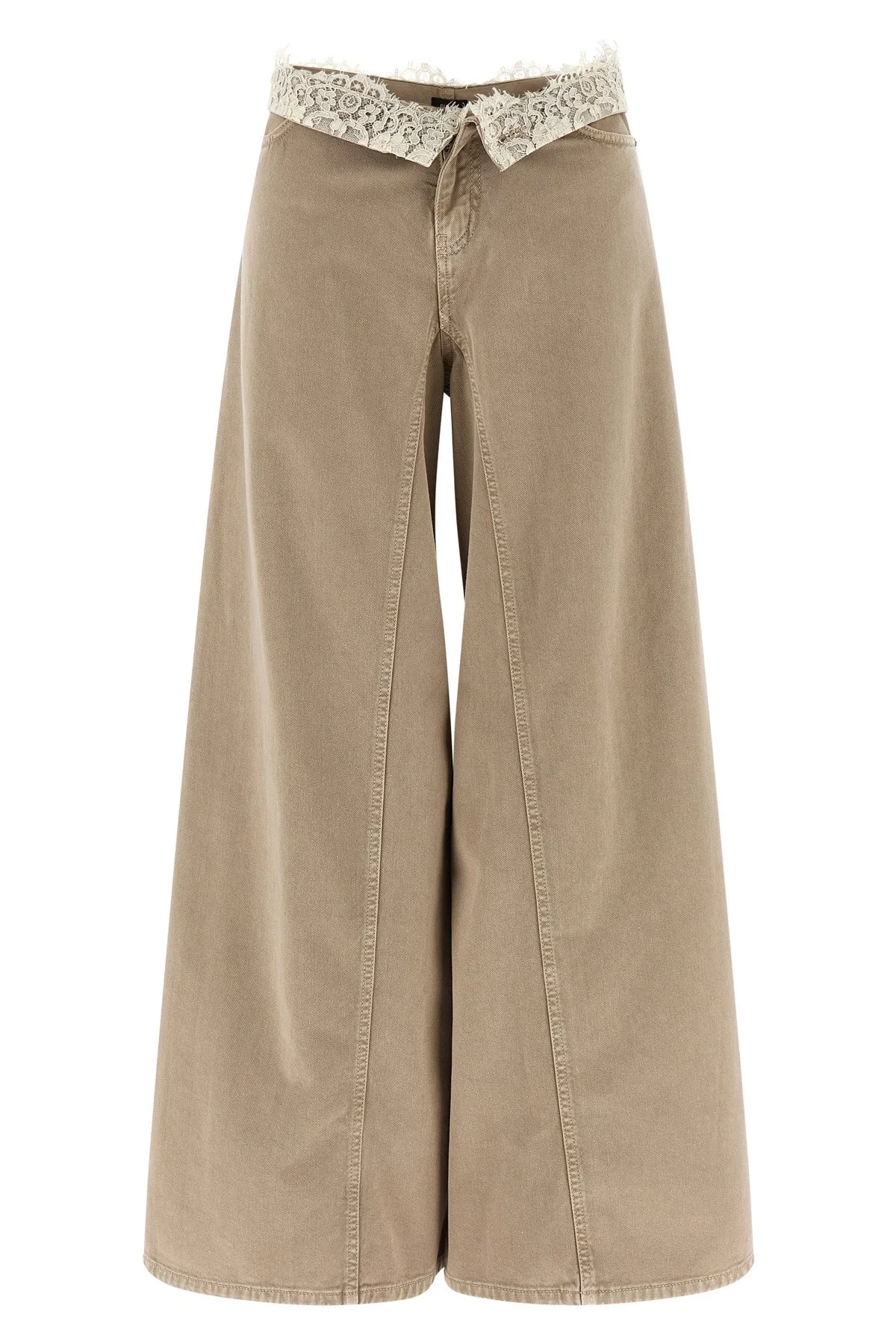 cod. 106462A364C88 'Winona' discolored-effect cotton bull denim jeans, extra wide leg, waist with contrast lace insert, pockets, zip and snap button closure that allows the model to be worn in two ways: high waist for a monochromatic effect or turned-up waist with lace in sight. Color: Beige Size & Fit: true to size fit Composition: 100% cotton Made in: Albania