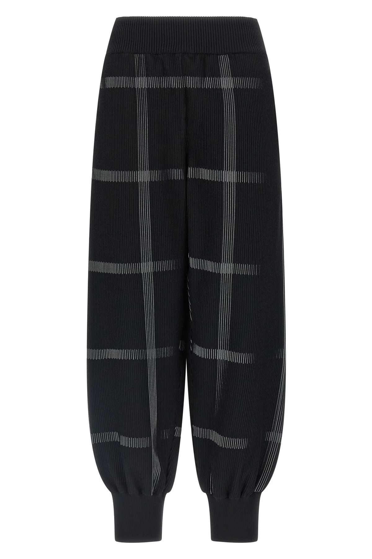 cod. PP66KF82215 'Crossing Knit' pants in ribbed knitted fabric with check pattern inspired by the cityscape, wide leg, drawstring elastic waistband, pockets, cuffs on the leg bottom. Color: Black Size & Fit: ONE SIZE Composition: 99% polyester, 1% nylon Made in: Japan