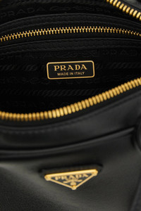 cod. 1BB152VOOO2CYSF0002 'Bauletto' leather handbag, double fixed handle, removable tag, triangle metal enamel front logo, adjustable and removable shoulder strap Color: Black Size & Fit: 20 11 X 5.5 Composition: 100% calfskin leather (Bos Taurus) Made in: Italy