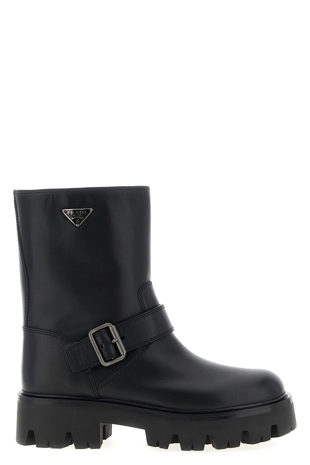 cod. 1U187OF050UZEF0002 Leather ankle boots, biker model, triangle logo in enameled metal on the side, rounded toe, tubular leg, adjustable strap on the instep, oversized rubber sole with tread pattern with gussets. Color: Black Size & Fit: EU WOMEN Composition: 100% calfskin leather (Bos Taurus) Made in: Italy