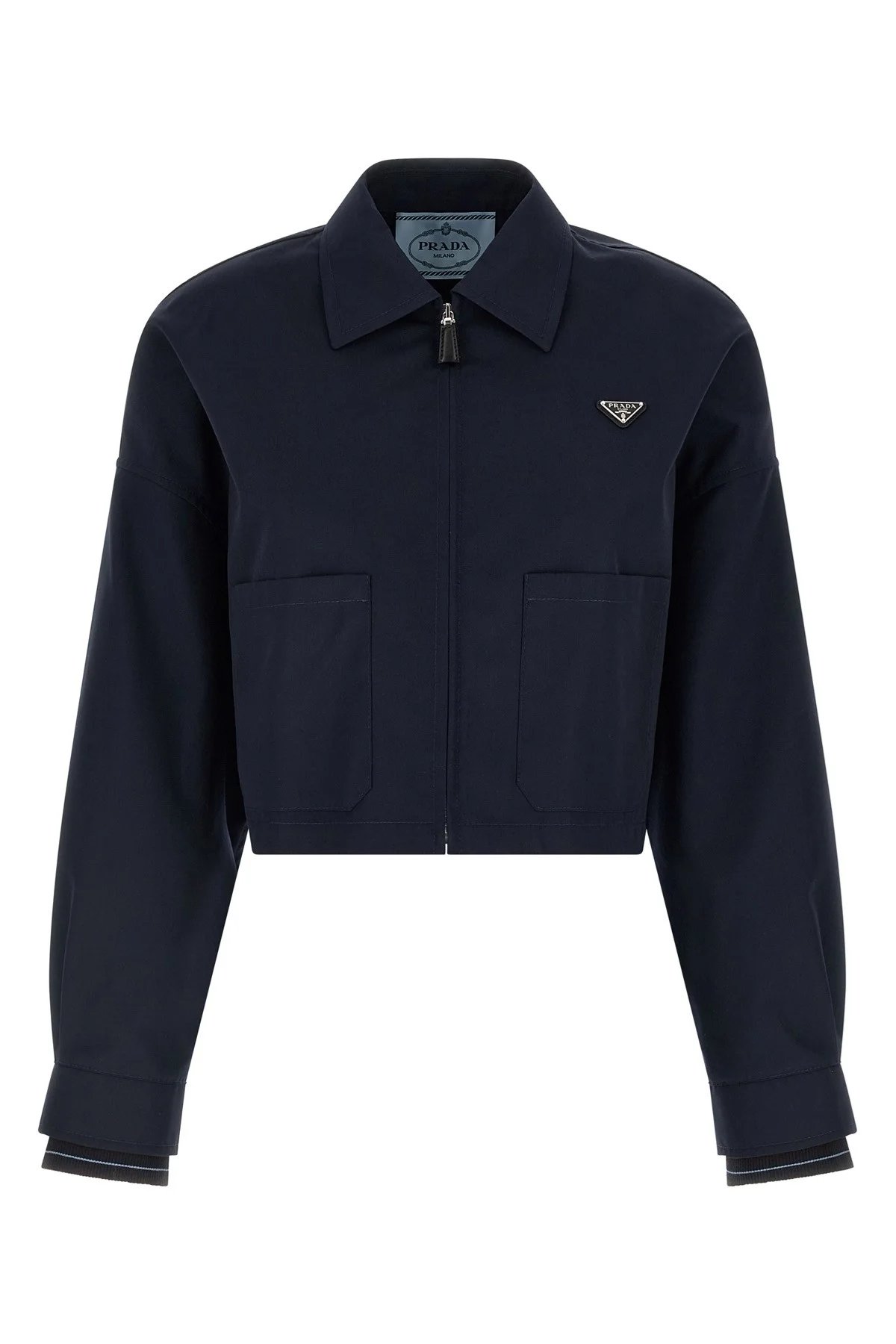 cod. P536OGSOOO187PF0008 Crop poplin blouson with triangle enameled metal logo and front zip closure, shirt collar, pockets, long sleeves with dropped shoulders and double layer cuffs with ribbed stretch knit insert, unlined. Color: Blue Size & Fit: oversized fit Composition: 65% polyester, 35% cotton Made in: Italy