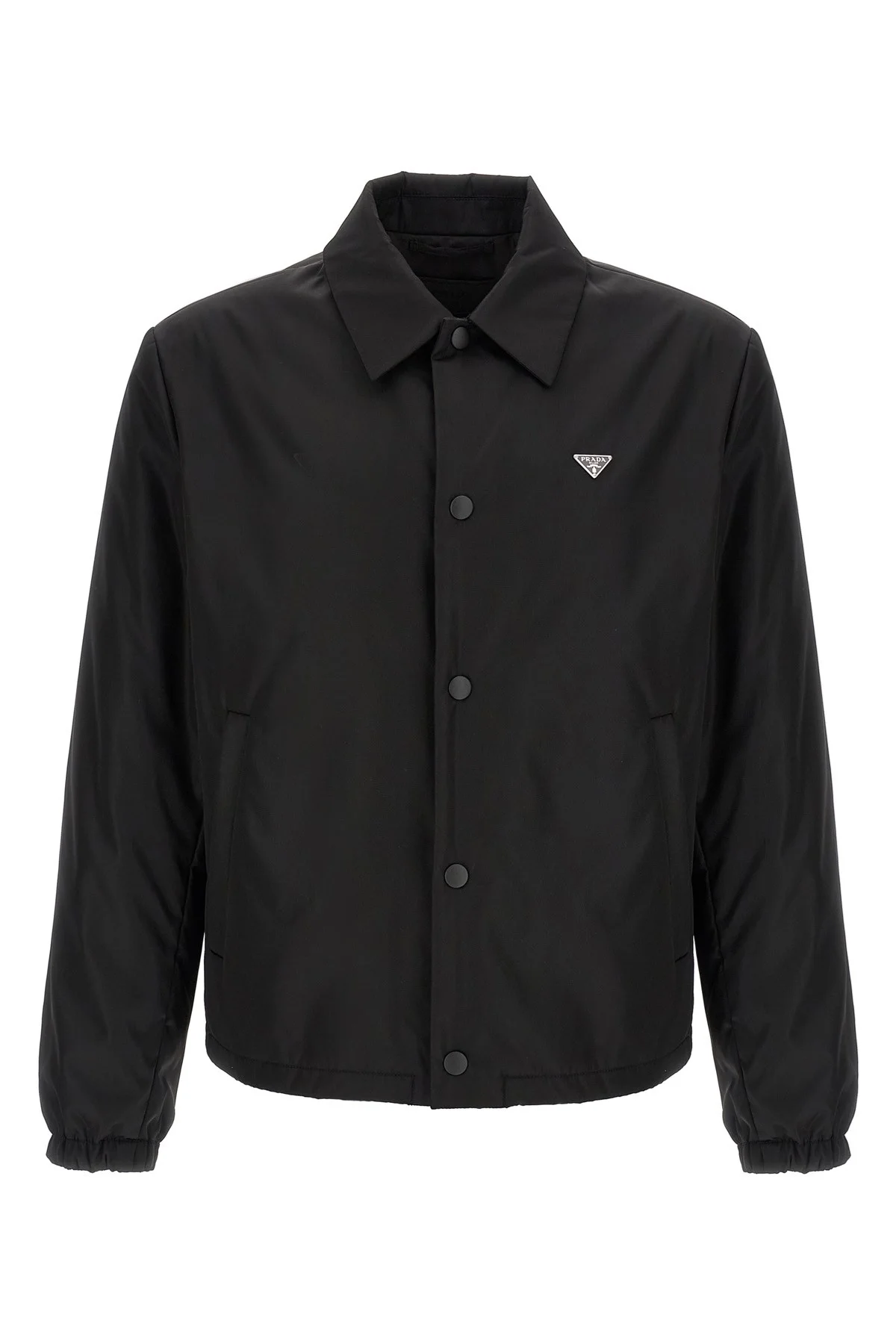 cod. SGD110SOOO1WQ8F0002 Lightly padded Re-Nylon blouson, triangle logo in enameled metal and front snap button closure, shirt collar, pockets, long sleeves with elastic cuffs, drawstring on the hem. SUSTAINABLE: This product is made with Re-Nylon, a regenerated yarn made from recycled and purified plastic collected in oceans, fishery nets and textile fibers. Color: Black Size & Fit: true to size fit Composition: 100% polyamide Made in: Italy