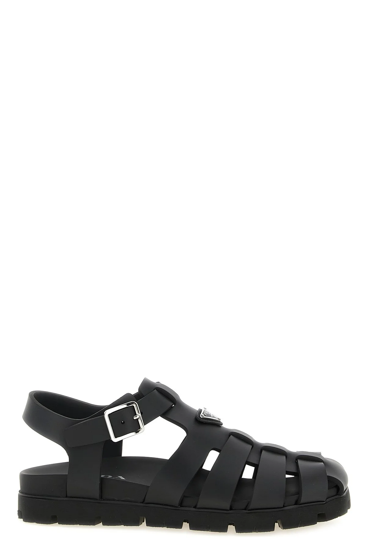cod. 2X3160FG0003LKKF0002 Rubber sandals, cage design, triangle logo in enameled metal on the front, wrapped leather insole, adjustable strap, rubber sole with notched tread. Color: Black Size & Fit: UK MEN Composition: 100% ethylvinyl acetate Made in: Italy