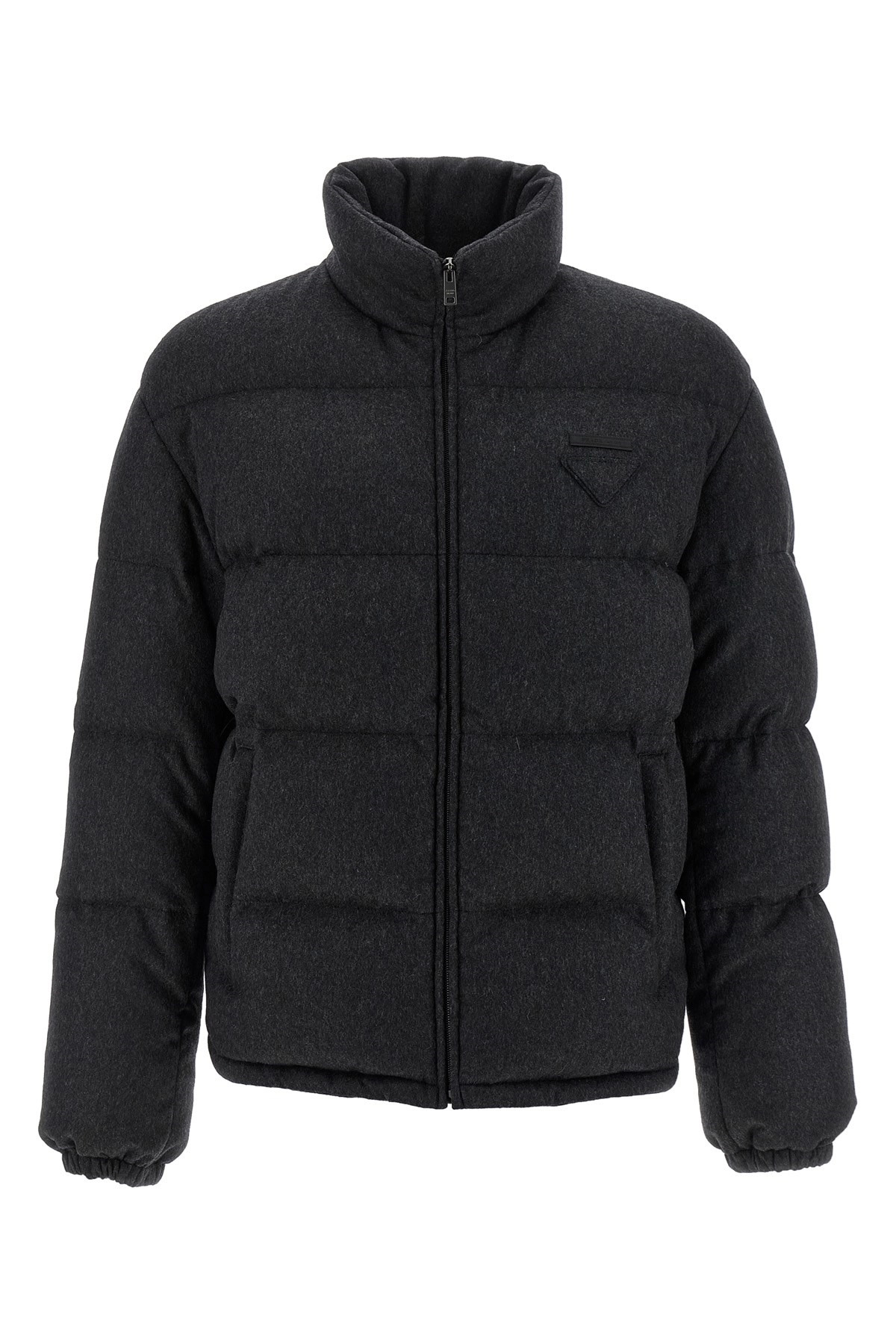 cod. SGC921SOOO17XTF0308 Quilted melange cashmere down jacket with goose feather padding, triangle logo in tone-on-tone fabric and front zip closure, standing collar, pockets, long sleeves with elastic cuffs, drawstring on the hem. Color: Gray Size & Fit: true to size fit Composition: 100% cashmere Made in: Italy PROMO CODE NOT APPLICABLE