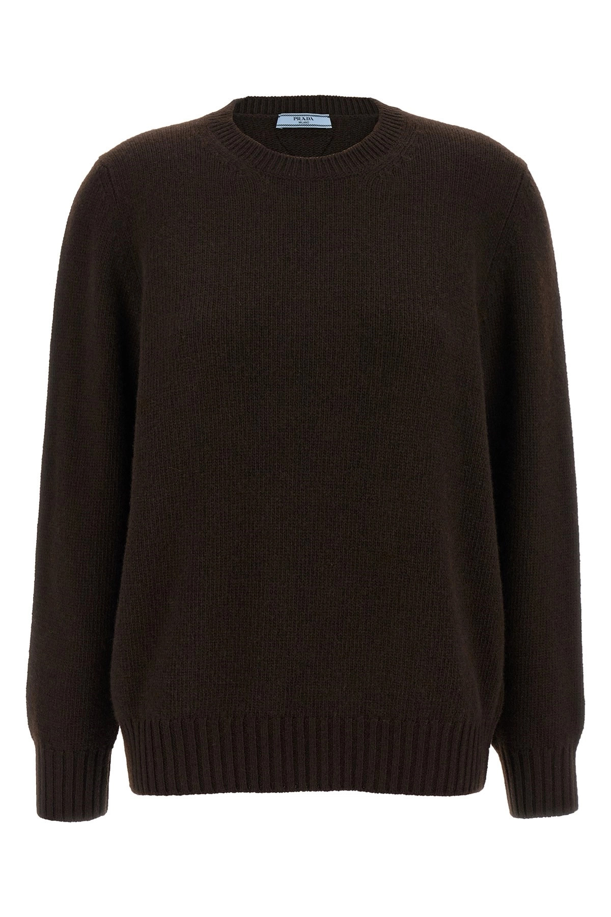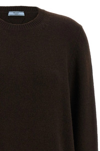 cod. P24A3ZS23213XAF0003 Virgin wool and cashmere sweater with crew neck, tone-on-tone triangle fabric logo on the back, long cuffed sleeves. Color: Brown Size & Fit: true to size fit Composition: 70% virgin wool 30% cachemire Made in: Italy