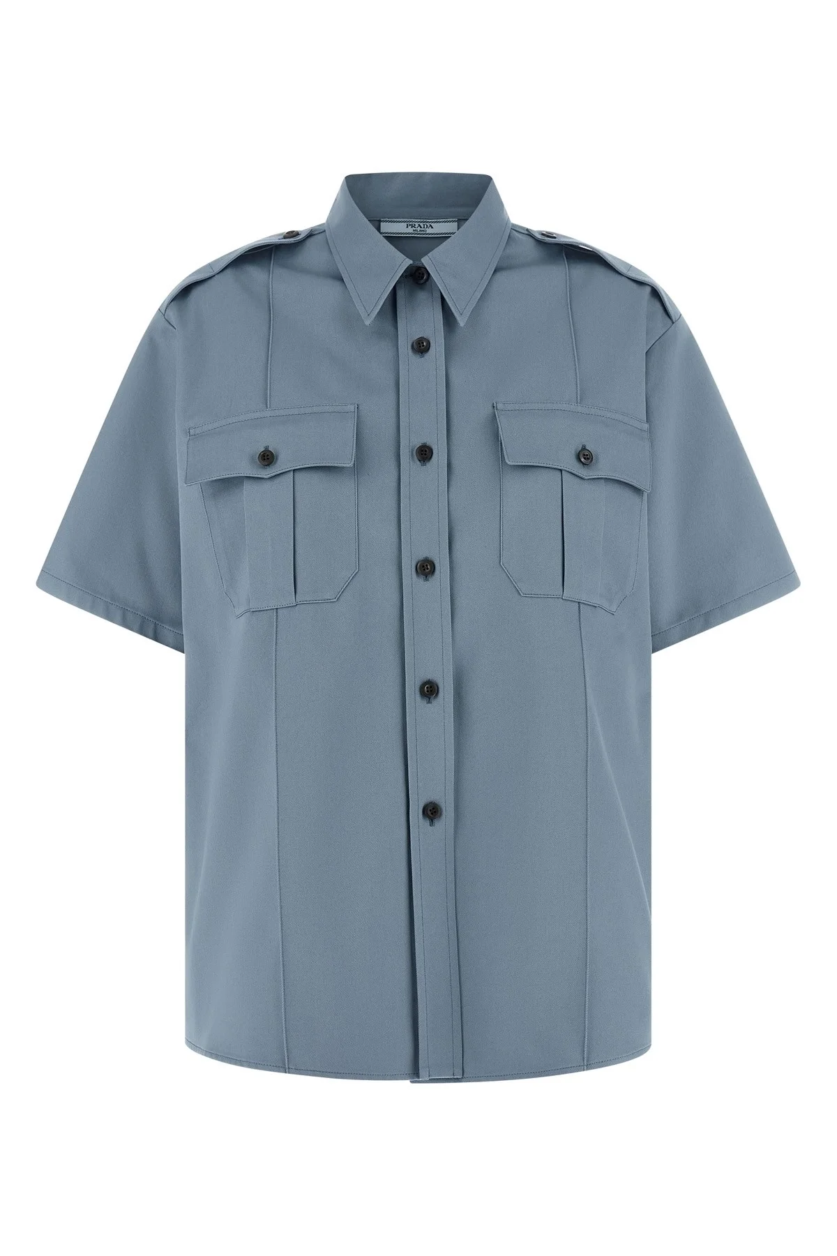 cod. P411JSOOO10YPF0154 Men's workwear chinoshirt in cotton with tone-on-tone triangle fabric logo on the back, pockets, front button closure, and short sleeves with toe on the shoulder. Color: Light Blue Size & Fit: true to size fit Composition: 100% cotton Made in: Italy