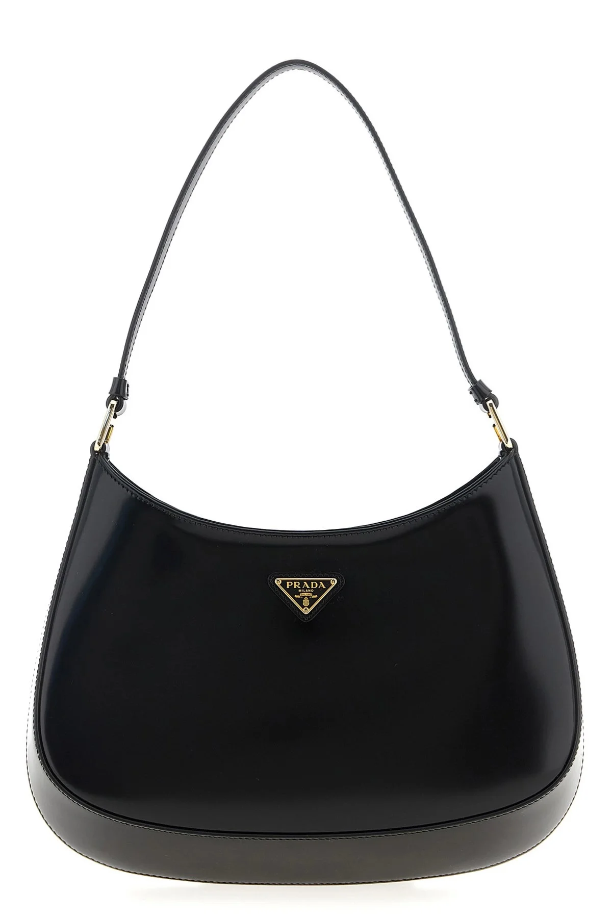cod. 1BC499VOOOZO6F0632 Cleo brushed leather shoulder bag with magnetic closure, adjustable handle, and front enameled metal triangle logo. Color: Black Size & Fit: W 27 x H 22 x 6 cm Composition: 100% calfskin leather (Bos Taurus) Made in: Italy