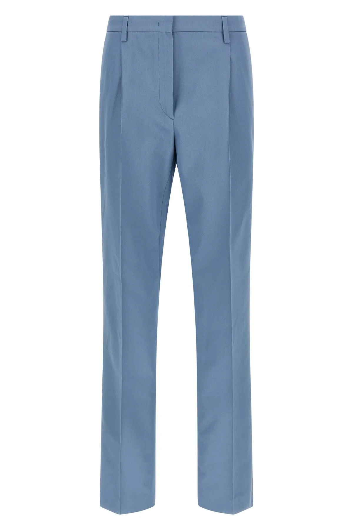 cod. P207KSOOO10YPF0154 Sustained cotton trousers, stretched pleat, pins, straight leg, zip and front hook closure, pockets. Color: Light Blue Size & Fit: true to size fit Composition: 100% cotton Made in: Italy