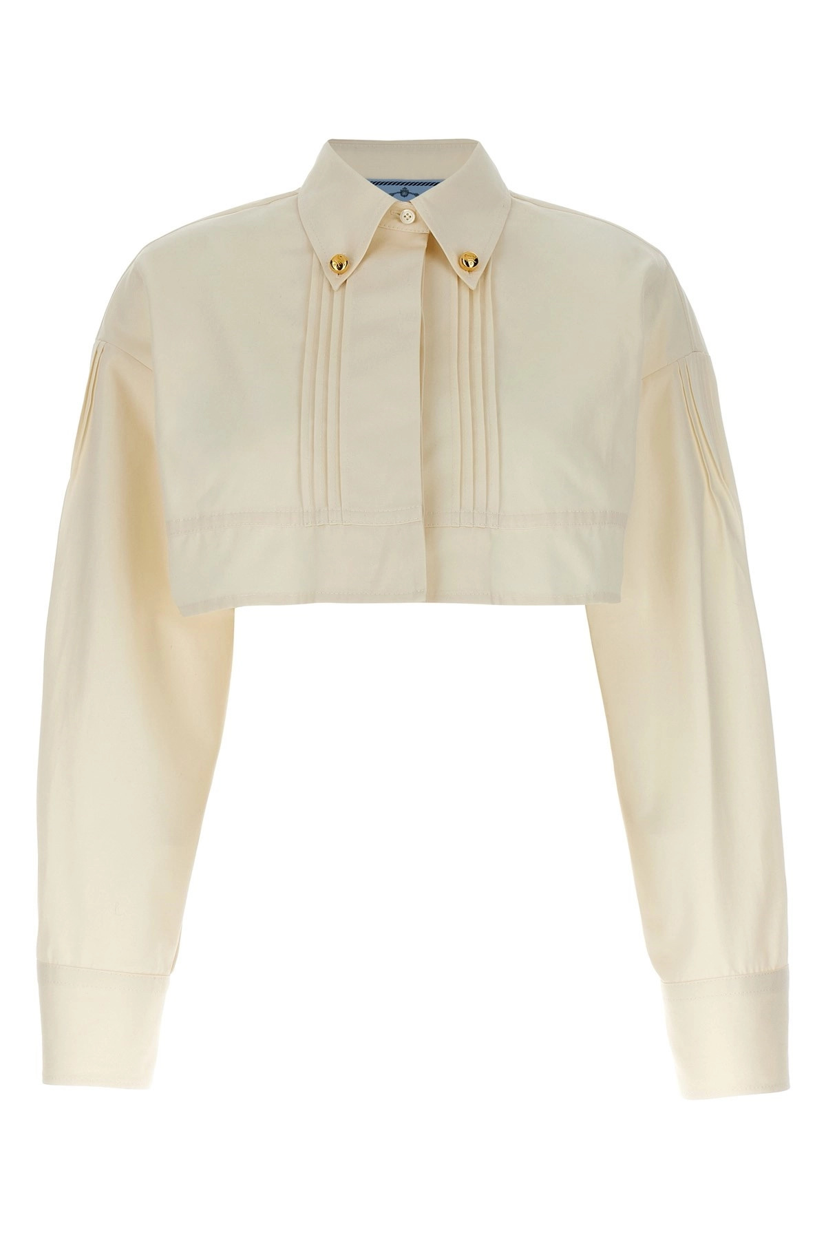 cod. P539OSOOO1BMSF0018 Cotton gabardine cropped jacket, plastron with pleats, covered button closure, shirt collar with gold buttons. Color: Beige Size & Fit: true to size fit Composition: 100% cotton