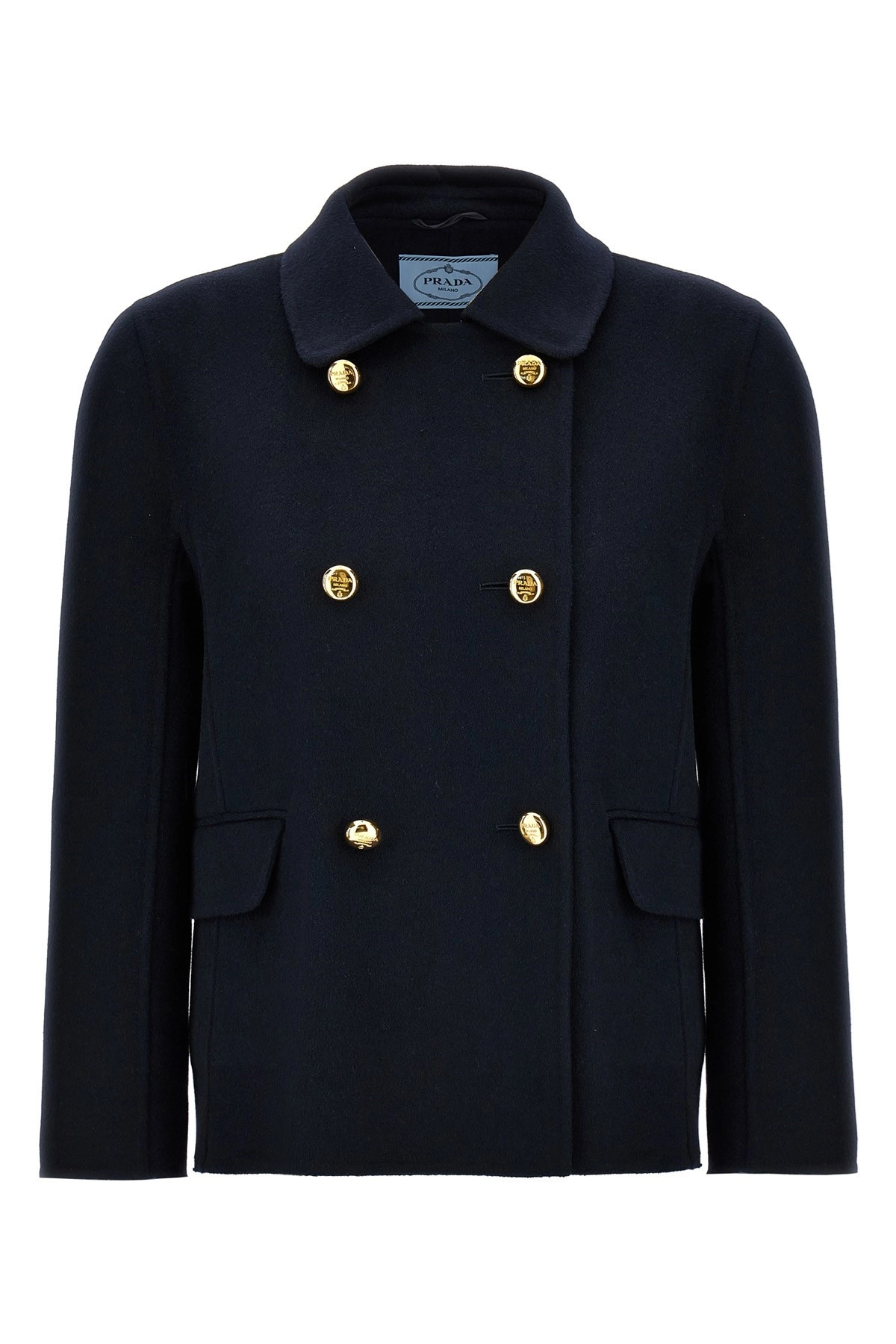 cod. P536PSOOO13FYF0008 Double-breasted cashgora coat with logo button closure, flap pockets, back metal logo applique, long sleeves. Color: Blue Size & Fit: true to size fit Composition: 55% wv, 40% wa, 5% wc Made in: Italy