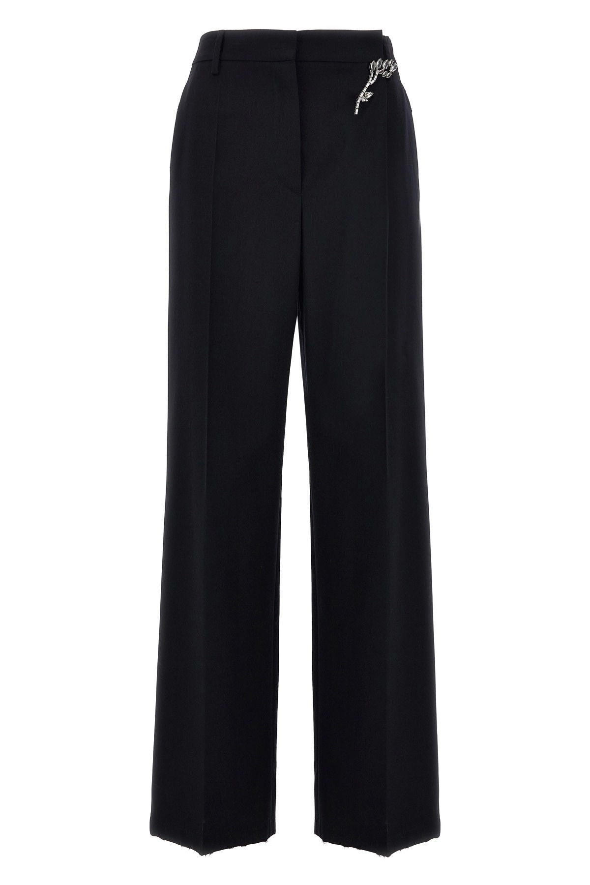cod. P238ISOOO15CDF0008 Wool gabardine pants, hook and button zip closure, pockets, straight leg with stretched crease and used-effect hem, jewel brooch detail. Color: Blue Size & Fit: true to size fit Composition: 100% wool Made in: Italy