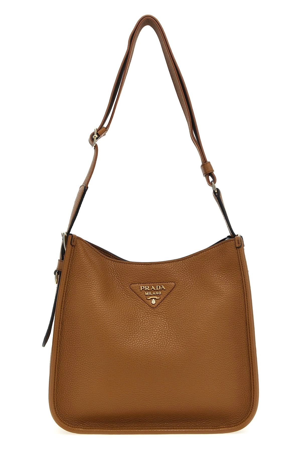 cod. 1BC073V7NO2DKVF03V8 Hobo crossbody bag in grainy leather with front metal lettering logo, magnetic closure, metal details, and adjustable shoulder strap in embroidered and logoed tape. Color: Brown Size & Fit: W 28 x H 26 x D 11 cm Composition: 100% calfskin leather (Bos Taurus) Made in: Italy