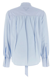 cod. P472ISOOO1XV2F0M10 Cotton poplin shirt, lavalliere collar with stitched bow detail, triangle logo in tone-on-tone fabric on the back, front button closure, long sleeves with maxi cuffs and crinkled shoulder. Color: Light Blue Size & Fit: true to size fit Composition: 100% cotton Made in: Italy