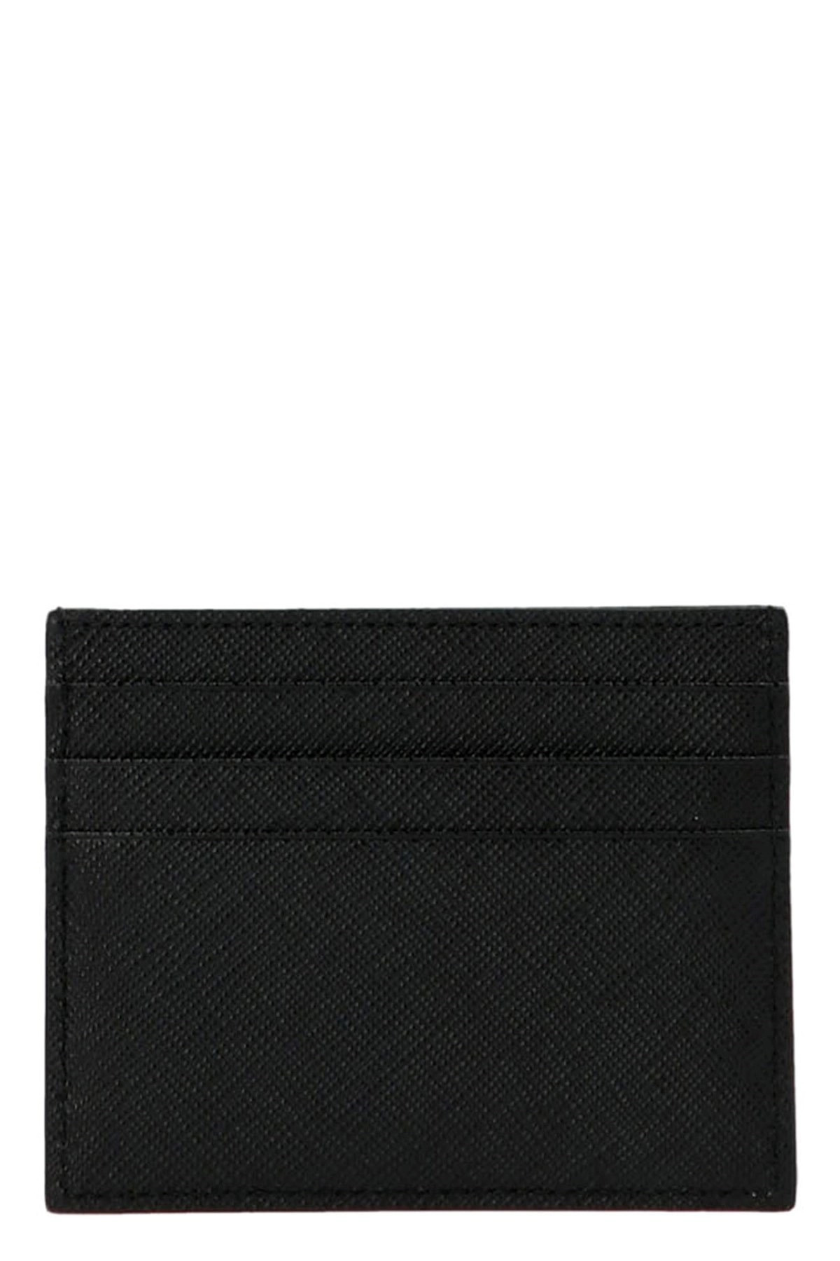 cod. 1MC025QHHF0002 Saffiano leather card holder with metal triangle logo, gold hardware. Color: Black Size & Fit: W 10 x H 8 cm Made in: Italy