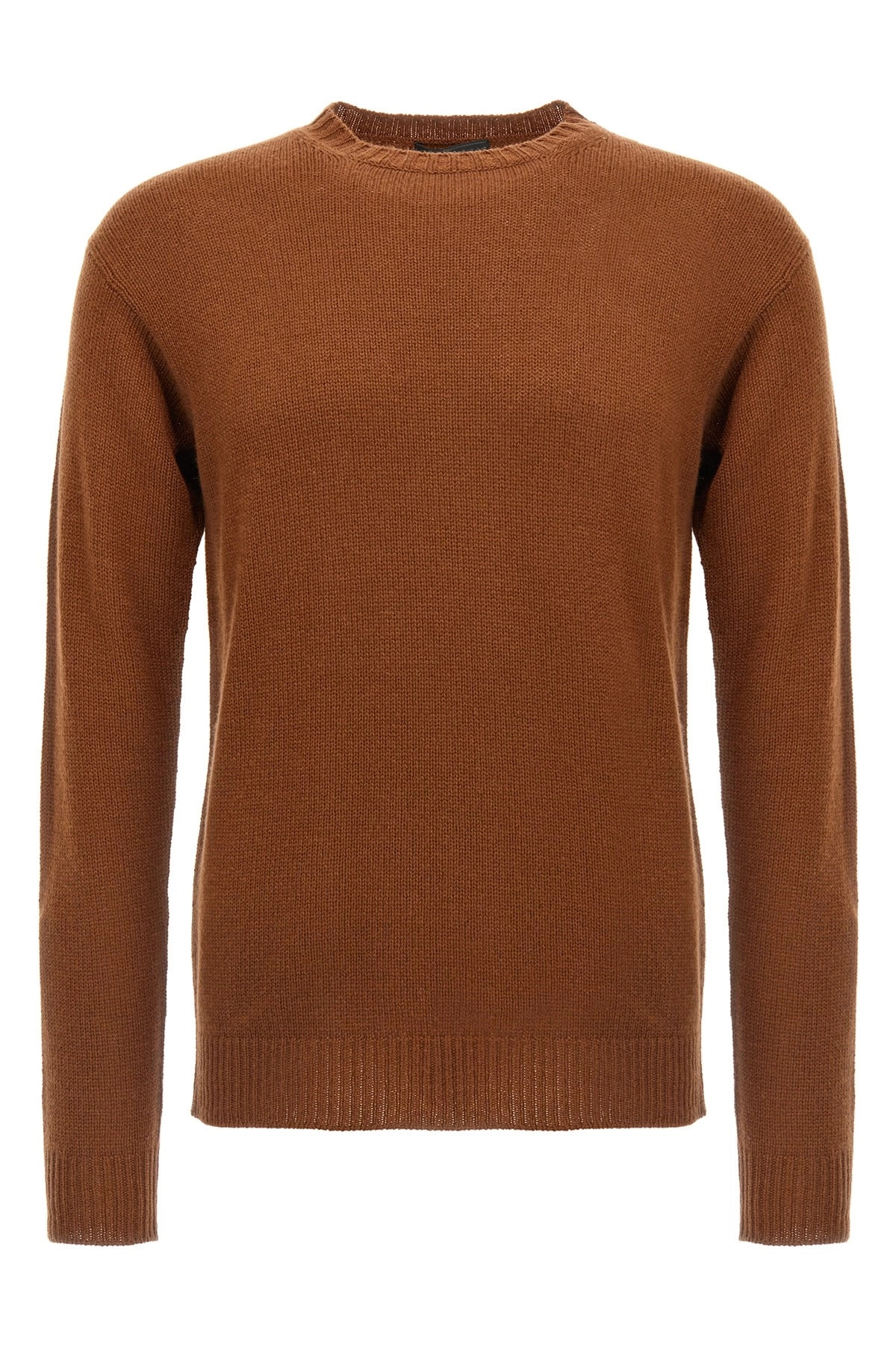 cod. UMB882SOOO15O5F0005 Cashmere sweater, triangle logo on the back, crew neck, long cuffed sleeves. Color: Brown Size & Fit: true to size fit Composition: 100% cashmere Made in: Italy