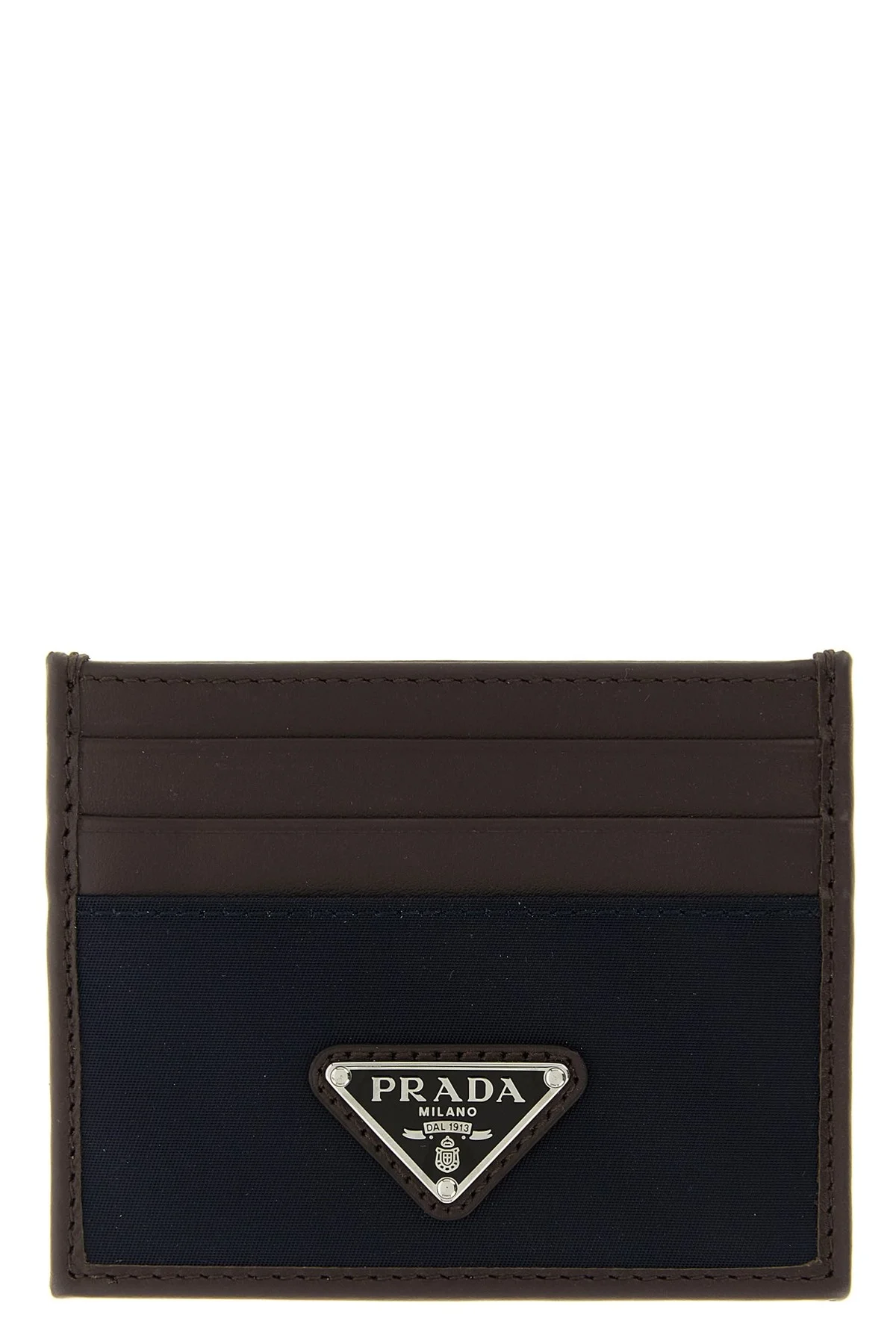 cod. 2MC0252DW3F0008 Leather card holder with nylon inserts, front logo and enamelled metal triangle. Color: Blue Size & Fit: 10 x 7.5 cm Composition: 100% recycled polyamide Made in: Italy PROMO CODE NOT APPLICABLE