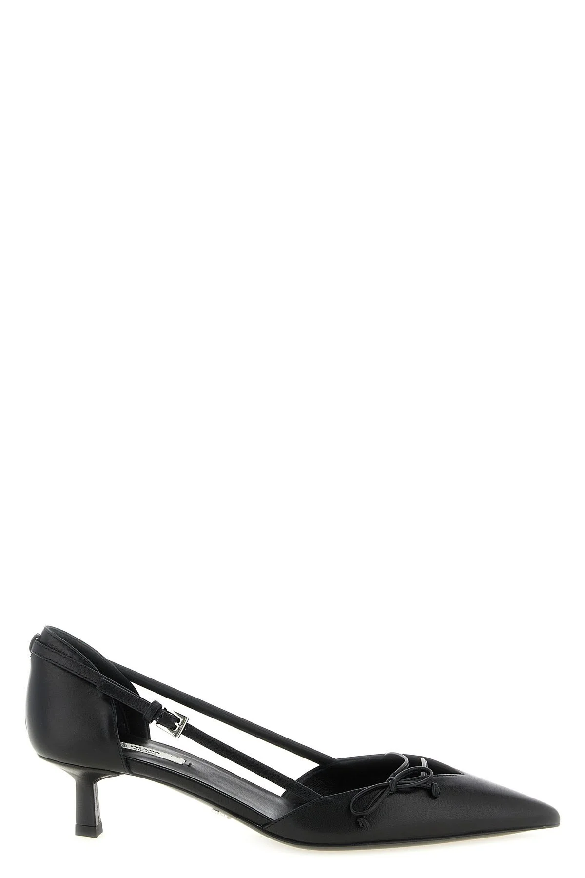 cod. 1I442OFB045011F0002 Leather pumps open to the sides with bow, strap with leather buckle and logo, leather sole with rubber needle with lettering logo. Color: Black Size & Fit: EU WOMEN Heels:4.5 Composition: 100% goat leather (Capra Hircus Hircus) Made in: Italy